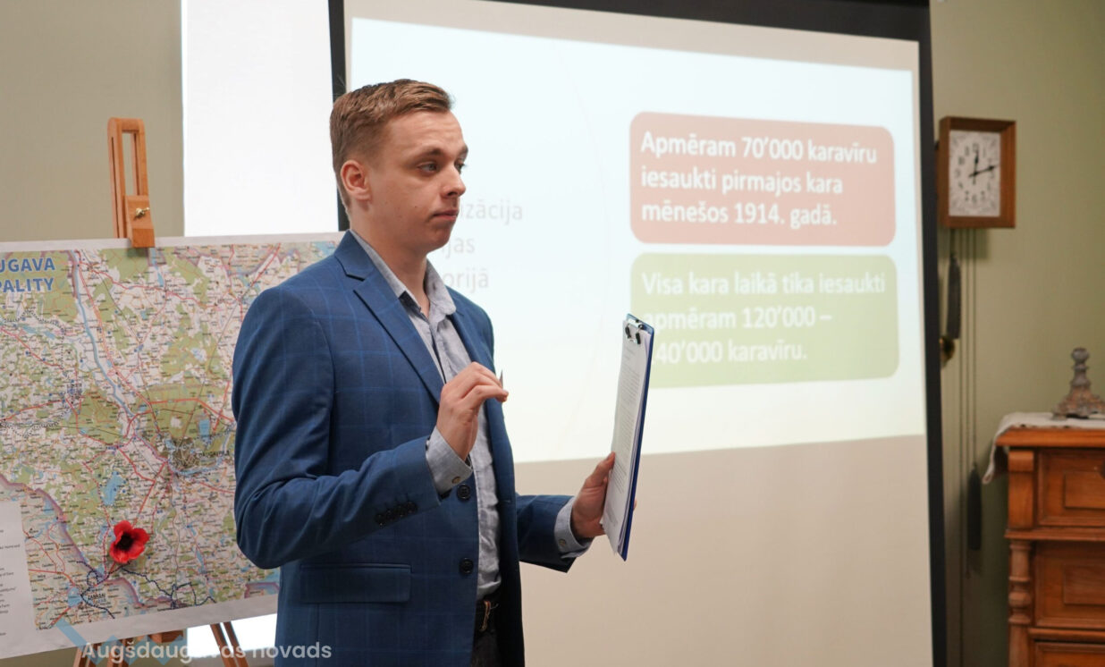 Referenti pievērsīsās Pirmā pasaules kara notikumiem mūsdienu Augšdaugavas novada teritorijā — mobilizācijai, frontes līniju attīstībai, karadarbības gaitai pie Ilūkstes, Dvietes, Daugavpils un Demenes, kā arī vācu armijas klātbūtnei un tās atstātajām pēdām muižās un kapsētās. Daugavpils Novadpētniecības un mākslas muzeja speciālists Kristaps Jumis pastāstīja par mobilizācijas gaitu Daugavpilī 1914. gadā, balstoties uz Dvinskas kara apriņķa priekšnieka rīkojumiem.