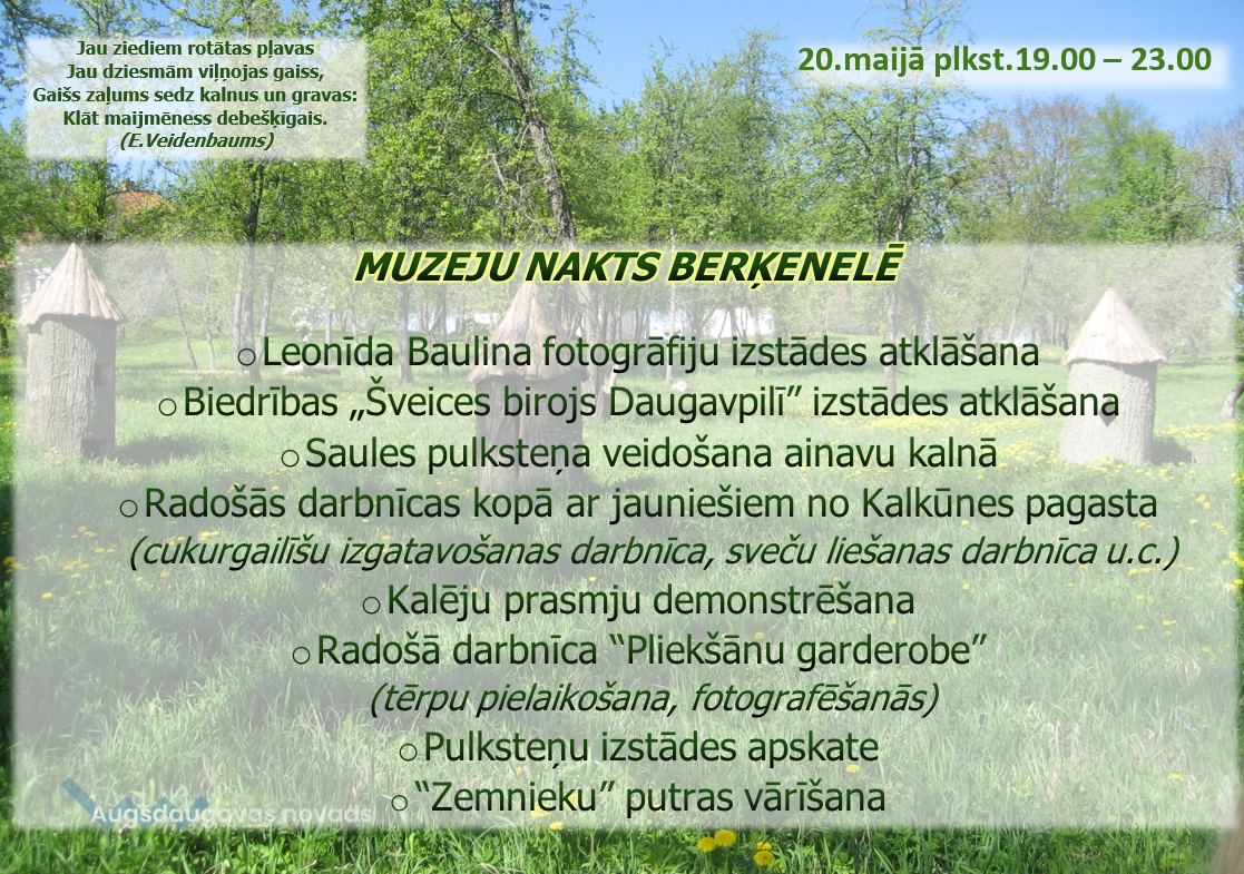 20. maijā no plkst.19.00 līdz 23.00 Muzeju nakts aktivitātes Raiņa mājā Berķenelē. Programmā: Leonīda Baulina fotogrāfiju izstādes atklāšana, biedrības „Šveices birojs Daugavpilī” izstādes atklāšana, saules pulksteņa veidošana ainavu kalnā, radošās darbnīcas kopā ar jauniešiem no Kalkūnes pagasta (cukurgailīšu izgatavošanas darbnīca, sveču liešanas darbnīca u.c.), kalēju prasmju demonstrēšana, radošā darbnīca “Pliekšānu garderobe” (tērpu pielaikošana, fotografēšanās), pulksteņu izstādes apskate un “Zemnieku” putras vārīšana.