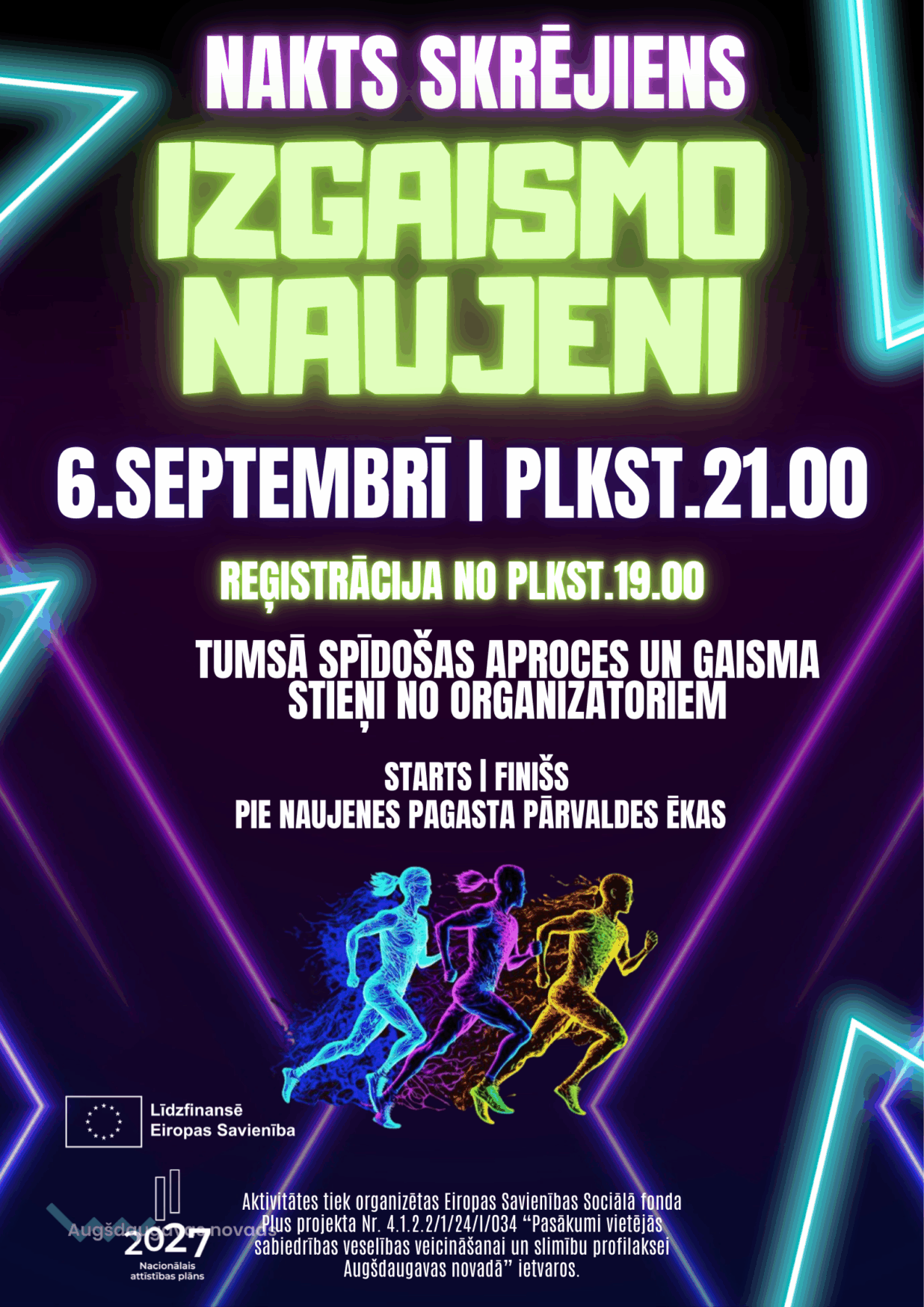 6.septembrī plkst.21.00 Naujeni izgaismos neona gaismas īpašajā nakts neona skrējienā, kurā aicināti piedalīties visi interesenti.
