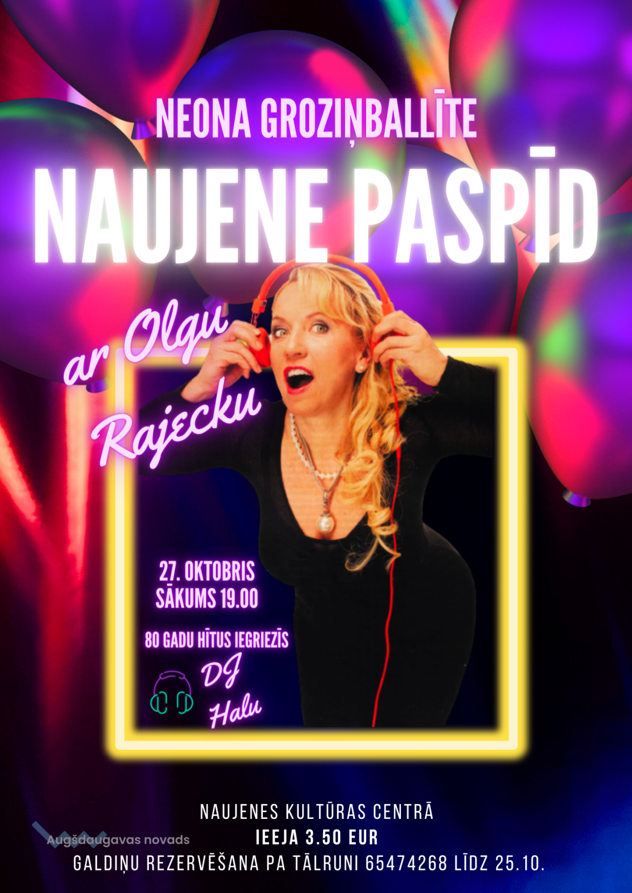Naujenes kultūras centrs aicina visus 27. oktobrī plkst. 19.00 uz rudens balli! “Iegriezīsim” rudeni ar košām neona krāsām, 80to gadu mūziku un… OLGU RAJECKU! Jā, Tu nepārklausījies – pašmāju estrādes leģenda Olga Rajecka iesildīs un iekrāsos košās muzikālās nokrāsās drūmo rudeni. Nepalaid garām iespēju ballēties neona groziņballītē “NAUJENE PASPĪD”, kurā 80to gadu hītus iegriezīs DJ Halu.