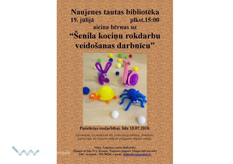 Naujenes tautas bibliotēka 19. jūlijā plkst. 15.00 aicina bērnus uz “Šenila kociņu rokdarbu veidošanas darbnīcu” (Daugavas ielā 31A, Krauja, Naujenes pagasts), tālr. uzziņām 65450246.