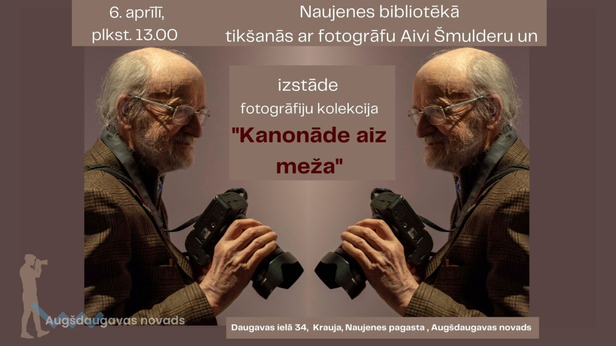 6. aprīlī plkst. 13.00 Naujenes bibliotēka, Daugavas ielā 34, Krauja, Naujenes pagasts, aicina uz tikšanos ar fotogrāfu Aivi Šmulderu, fotoizstādes “Kanonāde aiz meža” autoru. Tikšanās laikā būs iespēja uzzināt par autora radošo mūžu, fotogrāfijas žanru un tehniku meklējumiem un izstādes “Kanonāde aiz meža” fotokolekcijas veidošanu. Vairāk par izstādi šeit https://naujenestautasbibliotka.blogspot.com/2024/03/aicinam-uz-fotografiju-izstadi.html