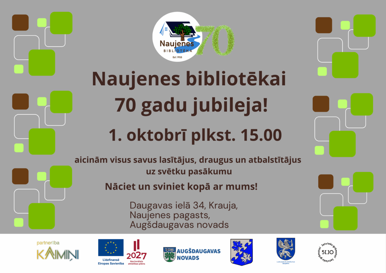 Mīļie lasītāji, draugi un sadarbības partneri! Ar prieku un lepnumu aicinām Jūs uz Naujenes bibliotēkas 70 gadu jubilejas svinībām, kas notiks 1. oktobrī plkst.15.00 Daugavas ielā 34, Kraujā, Naujenes pagastā. Šī diena būs īpaša – atskatīsimies uz bibliotēkas vēsturi, godināsim tās darbiniekus un lasītājus, dalīsimies atmiņās un kopīgi svinēsim lasītprieku, zinātkāri un kopības sajūtu. Naujenes bibliotēka – vieta, kur vārdi dzīvo, un stāsti vieno paaudzes.