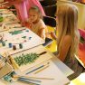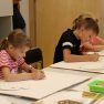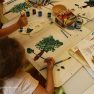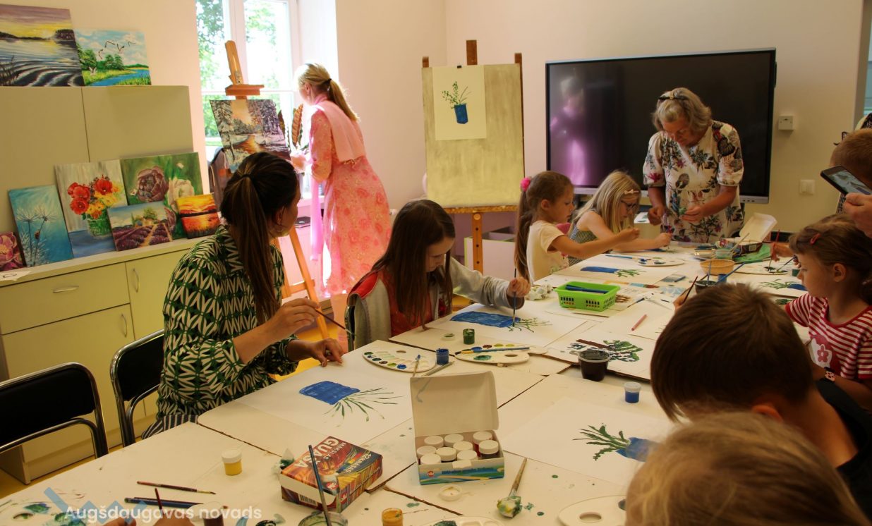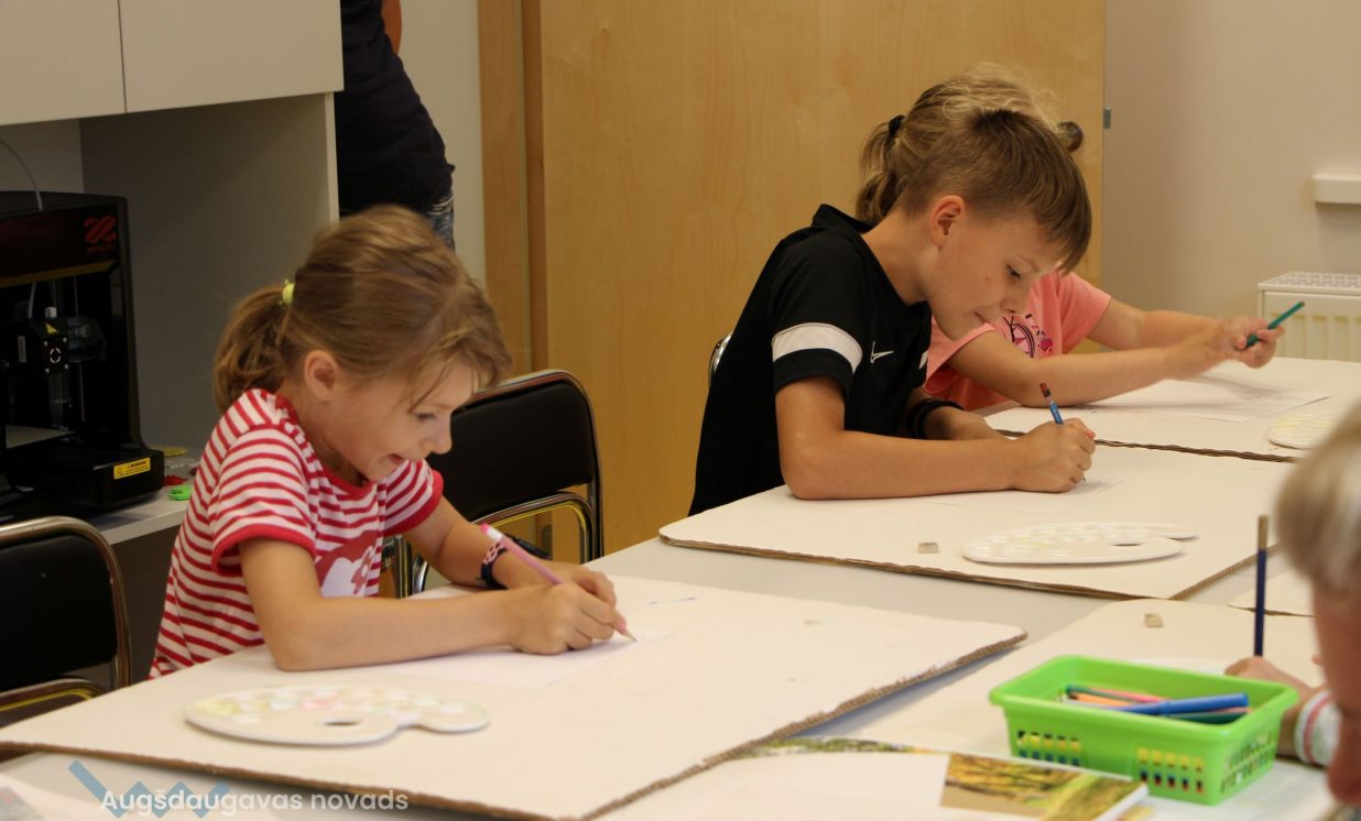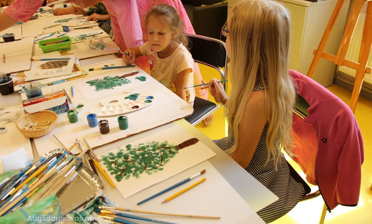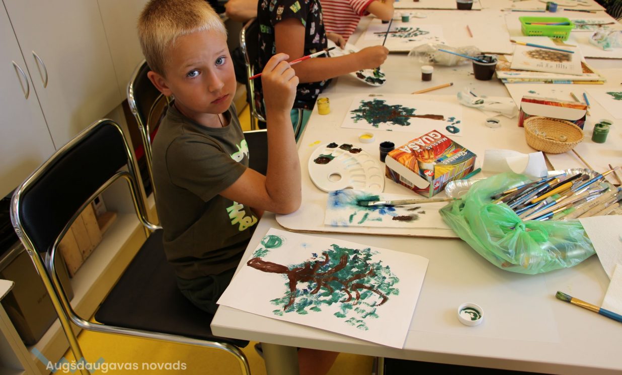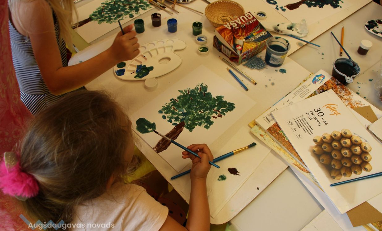 Iesākām ar parastiem uzdevumiem, zīmējot ar zīmuļiem. Tad pievienojām guašas krāsas un uzzīmējām kokus dažādās tehnikās. Uzzinājām, kā pareizi turēt otu, kādu otas izmēru izvēlēties konkrētam uzdevumam, iemācījāmies jaukt krāsas, veidojot visdažādākos toņus. Nodarbības pēdējā daļā uz papīra parādījās vāzes ar krāšņām puķēm un autoru parakstiem.