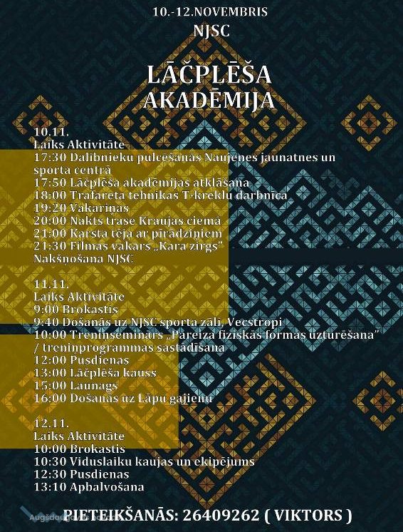 10.-12. novembrī Naujenes pagastā norisināsies jauniešiem veltīts pasākumu cikls “Lāčplēša akadēmija”. Pasākums ievadīs Patriotu nedēļu, kura ilgst no 11. novembrim līdz Latvijas Neatkarības dienai.