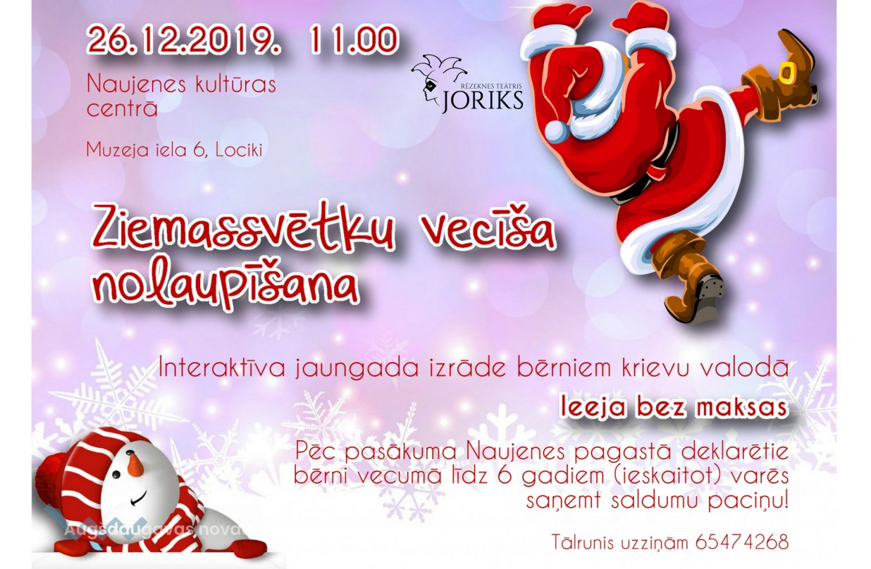 Meža gariņš nevēlas, lai pienāk Jaunais gads, tāpēc izdomāja nozagt Ziemassvētku vecīša mēteli, kuram piemīt burvestības spēks. Lai izglābtu svētkus, Sniegbaltīte, raganiņas un citi pasakas varoņi steidzas palīgā Ziemassvētku vecītim. Vai labajam izdosies uzveikt ļauno? Vai meža gariņam izdosies apturēt Jauno gadu? Atbildi uz šiem jautājumiem uzzināsiet 26. decembrī plkst. 11.00, kad Naujenes kultūras centrā notiks Rēzeknes pilsētas Teātra-studijas “Joriks” piedāvātā interaktīvā jaungada izrāde “Ziemassvētku vecīša nolaupīšana”.