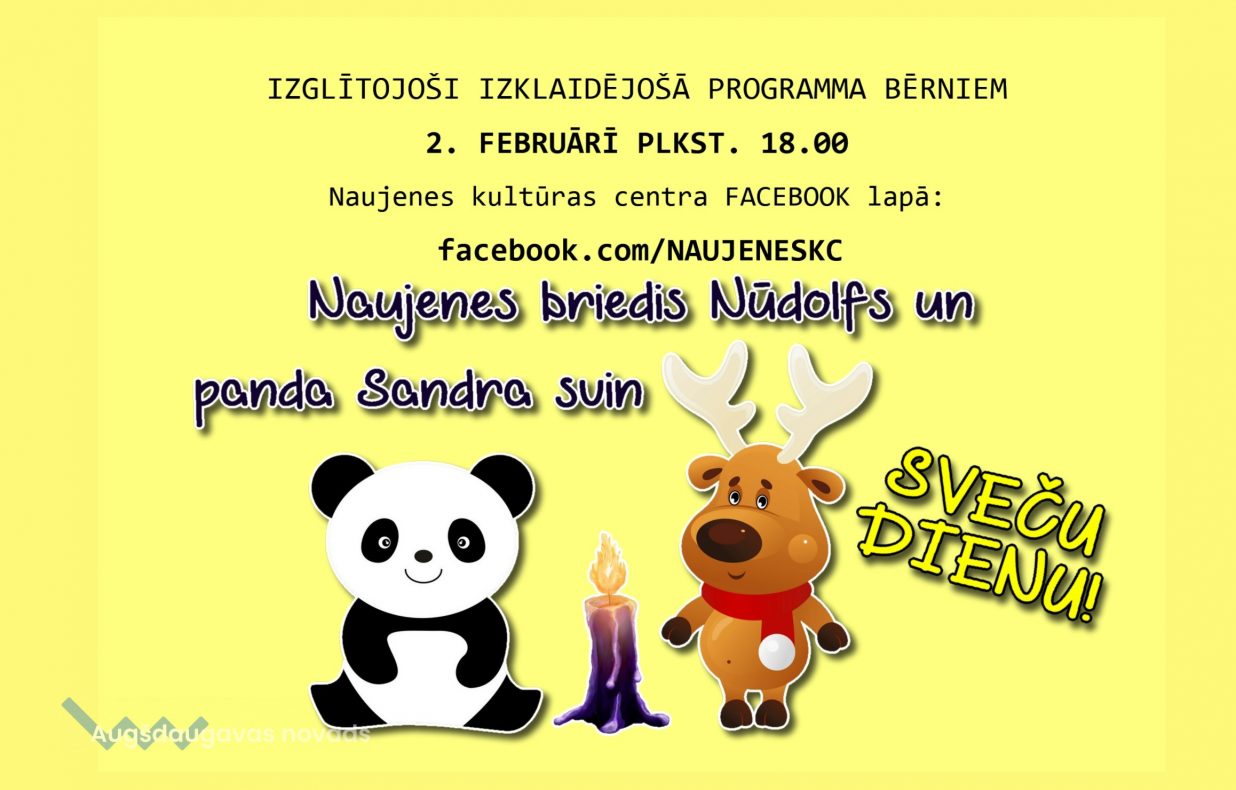 Mīļie vecāki, piedāvājam Jums variantu kā kopā ar bērniem lietderīgi pavadīt otrdienas vakaru! 2. februārī plkst. 18.00 dodaties uz Naujenes kultūras centra facebook profilu: www.facebook.com/NAUJENESKC, kur Naujenes briedis Nūdolfs un panda Sandra svinēs Sveču dienu – būs dažas fiziskās aktivitātes, jautras dejas, pastāstīsim, kas ir Sveču diena un parādīsim kā uztaisīt savu svecīti!