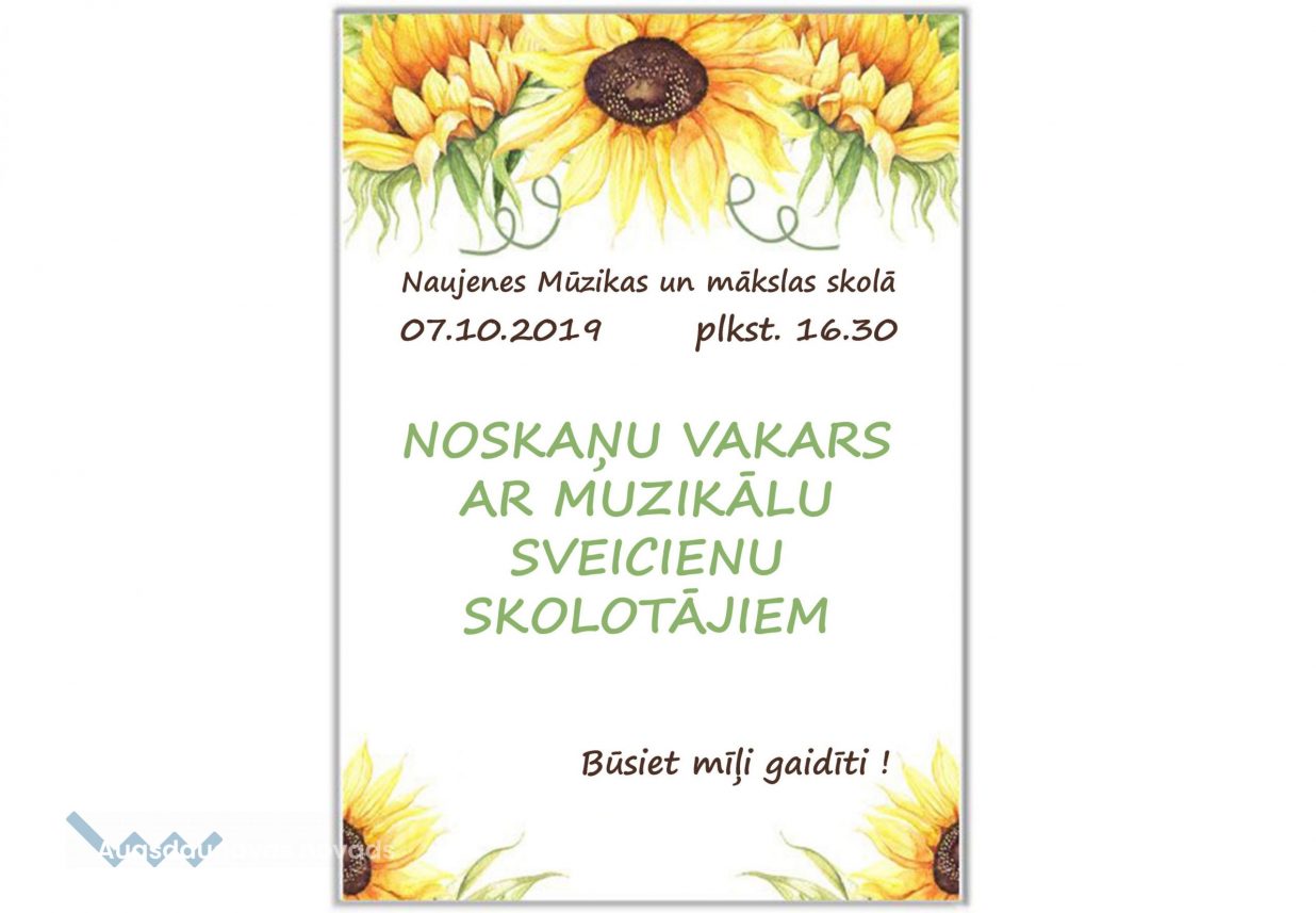 7. oktobrī, plkst. 16:30 Naujenes Mūzikas un mākslas skola ielūdz uz koncertu, kas veltīts skolotāju dienai!