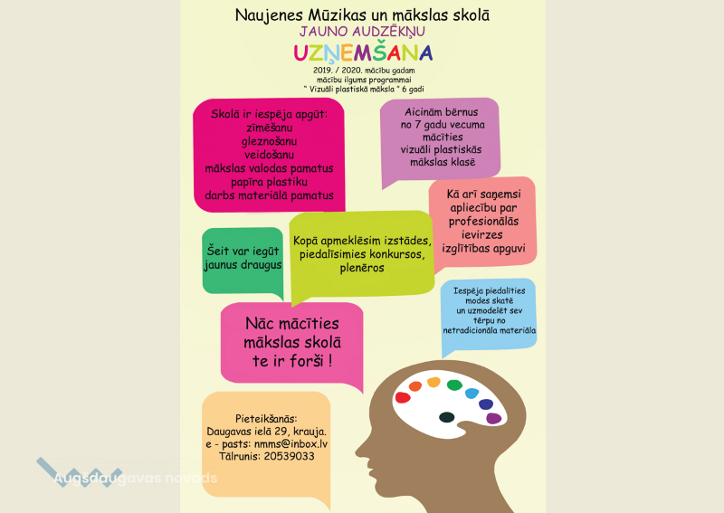 Naujenes Mūzikas un mākslas skola izsludina jauno audzēkņu uzņemšanu 2019./2020. mācību gadam programmā "Vizuāli plastiskā māksla" (no 6 gadiem). Pieteikšanās: Daugavas ielā 29, c. Krauja, nmms@inbox.lv, tel. 20539033