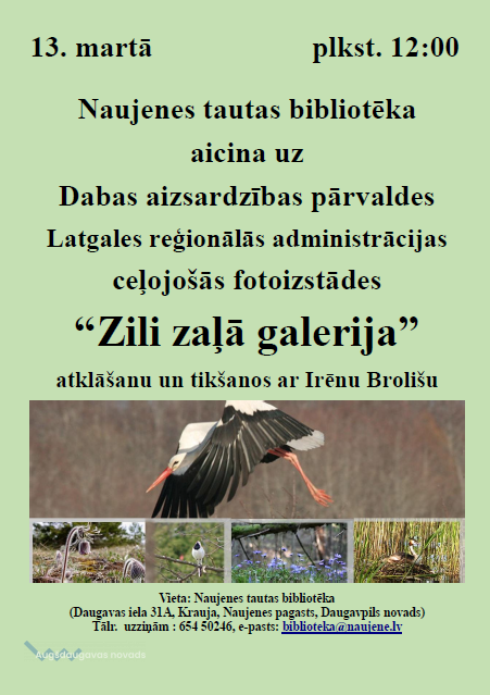 13. martā plkst. 12.00 Naujenes pagasta Tautas bibliotēka aicina uz Dabas aizsardzības pārvaldes Latgales reģionālās administrācijas ceļojošās fotoizstādes “Zili zaļā galerija” atklāšanu un tikšanos ar Irēnu Brolišu, Daugavas ielā 31A, c. Krauja, Naujenes pagasts, Daugavpils novads. Tālr. uzziņām 65450246.