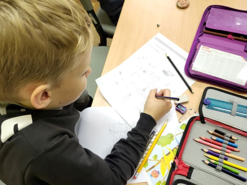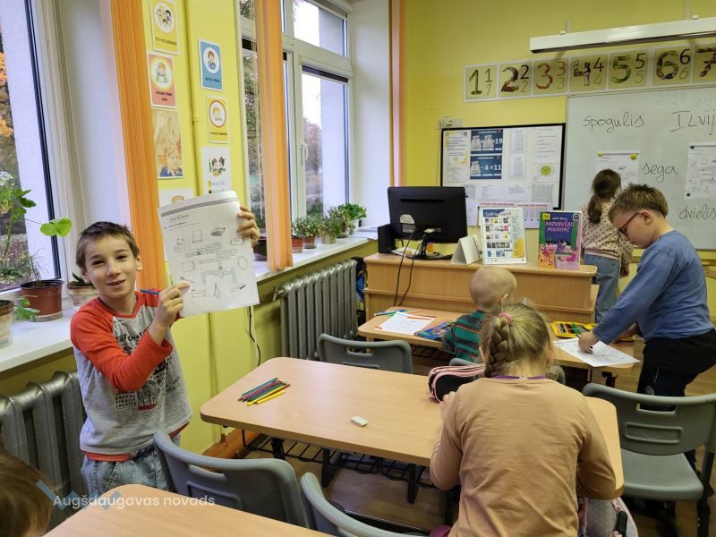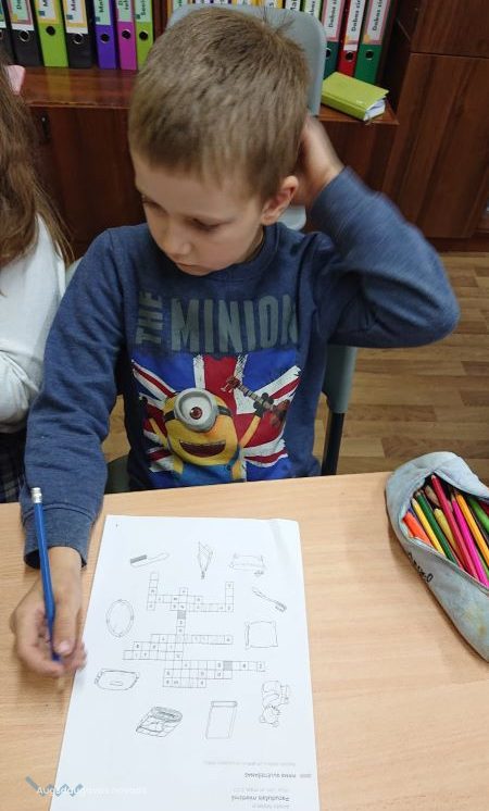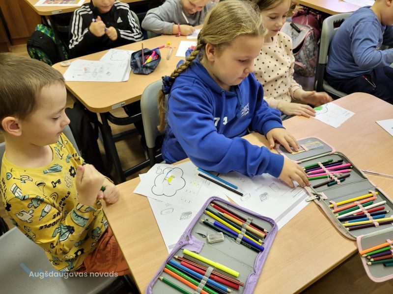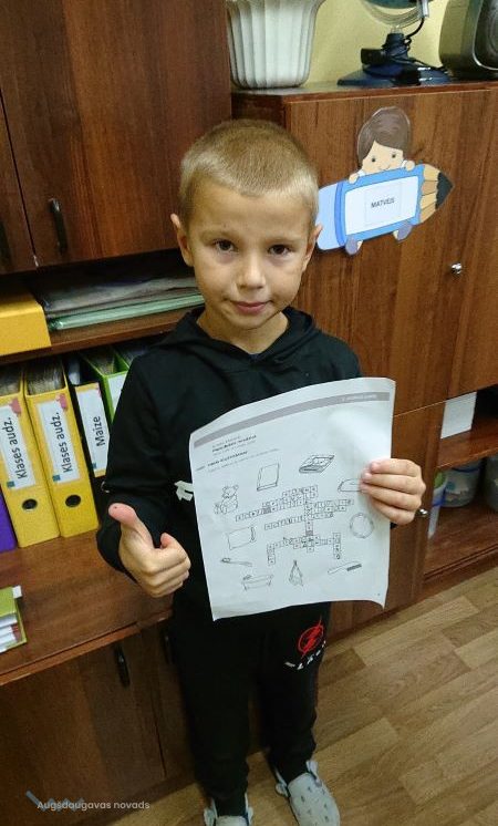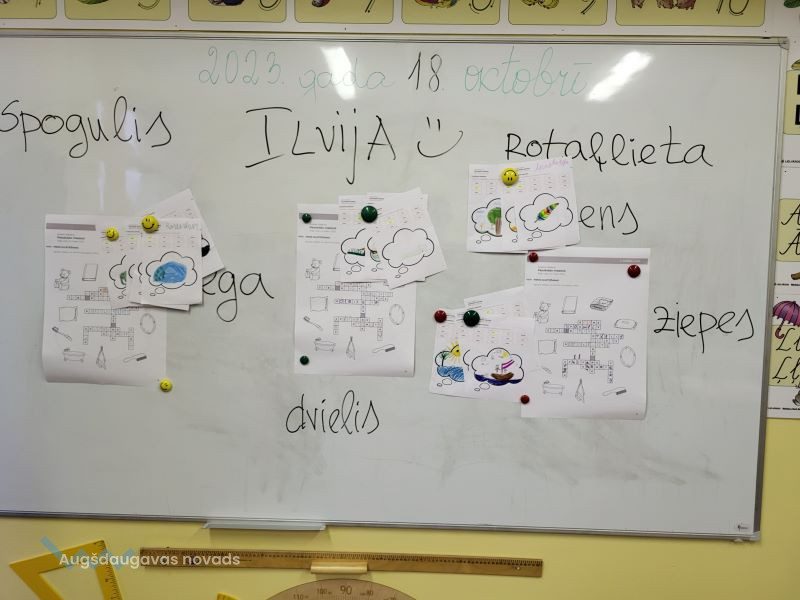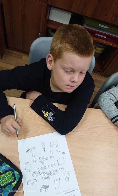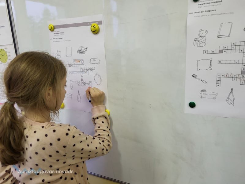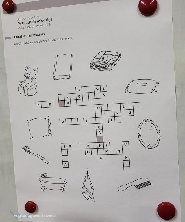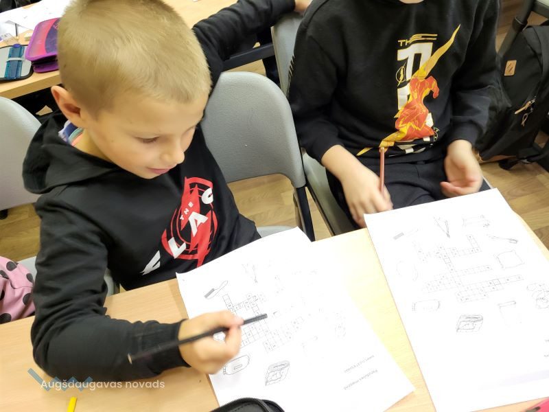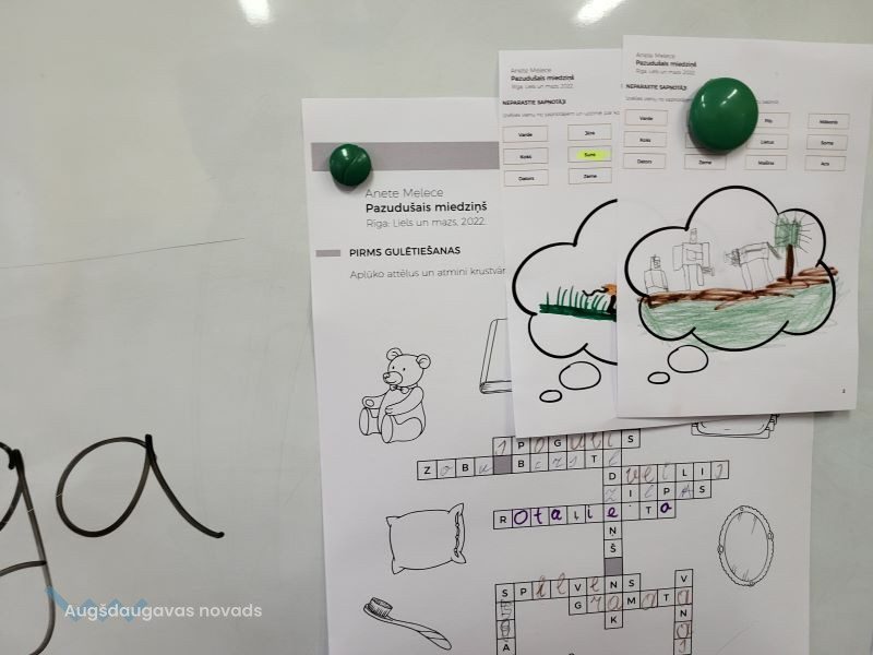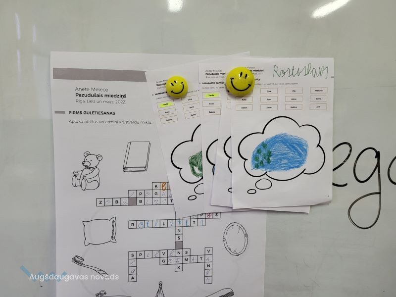 Bibliotekārās nodarbības turpinājumā 1. un 2. klases skolēniem vajadzēja atminēt krustvārdu mīklu pirms gulētiešanas – jāaplūko attēli, kuri saistīti ar gulēšanu, un jāatmin vārdi. Pēc tam skolēni darbojās aktīvi – viņiem bija jāizvēlas kāds no sapņotājiem un jāuzzīmē, par ko tas varētu sapņot.