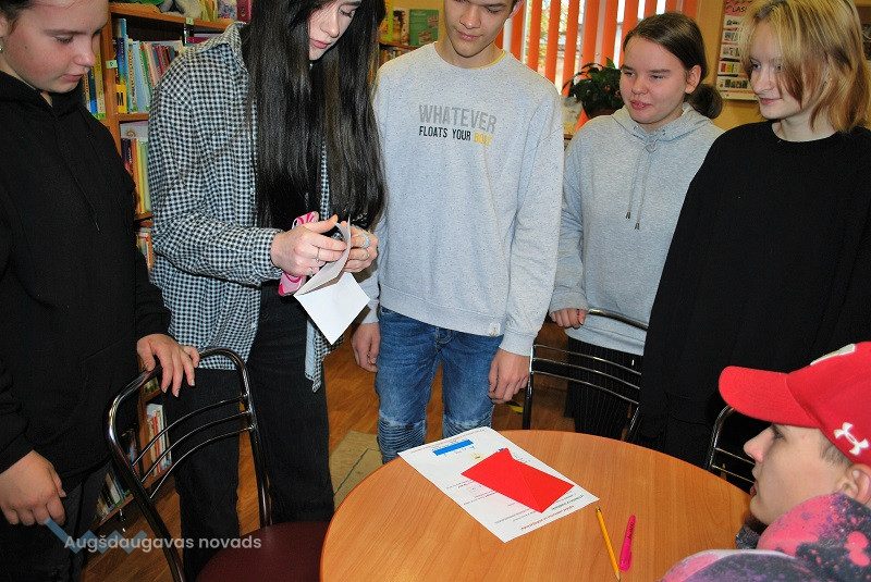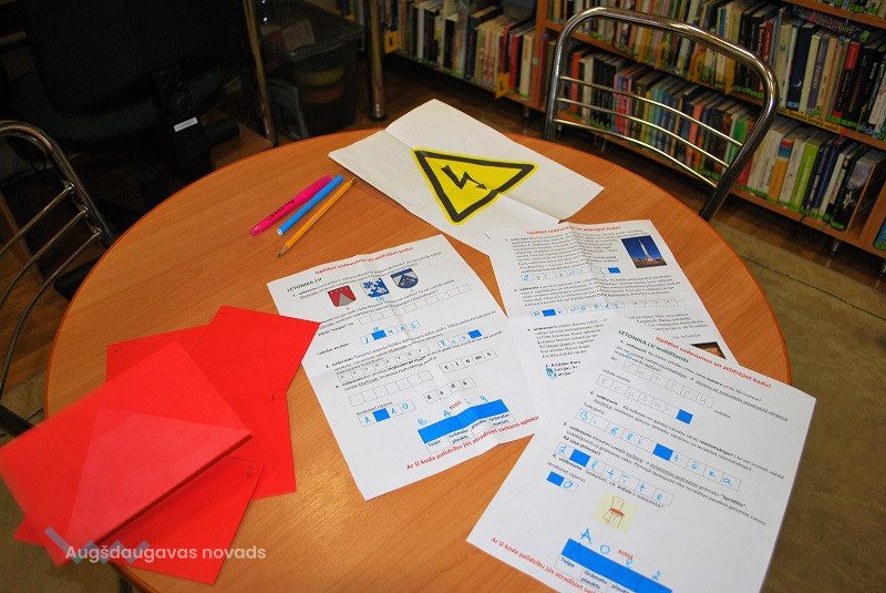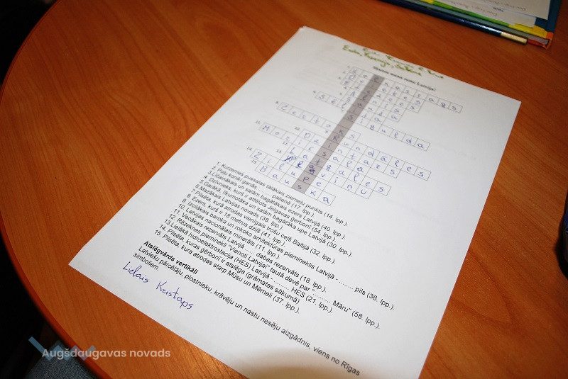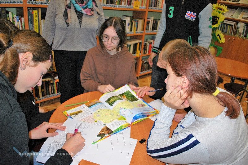 Kamēr viena komanda pildīja kvestu, otra komanda bibliotēkas lasītavā piedalījās e-viktorīnā “Ko tu zini par Latviju?”. Skolēni minēja krustvārdu mīklu un, izmantojot grāmatu “Latvija: atlants bērniem”, pildīja testu. Mūsu audzēkņi papildināja savas ģeogrāfijas zināšanas, jo uzzināja par Latvijas lielākajām ūdenstilpnēm, par dabas parku bagātībām un tajos sastopamajiem augiem, kā arī pētīja Latvijas pilsētu ģerboņus.