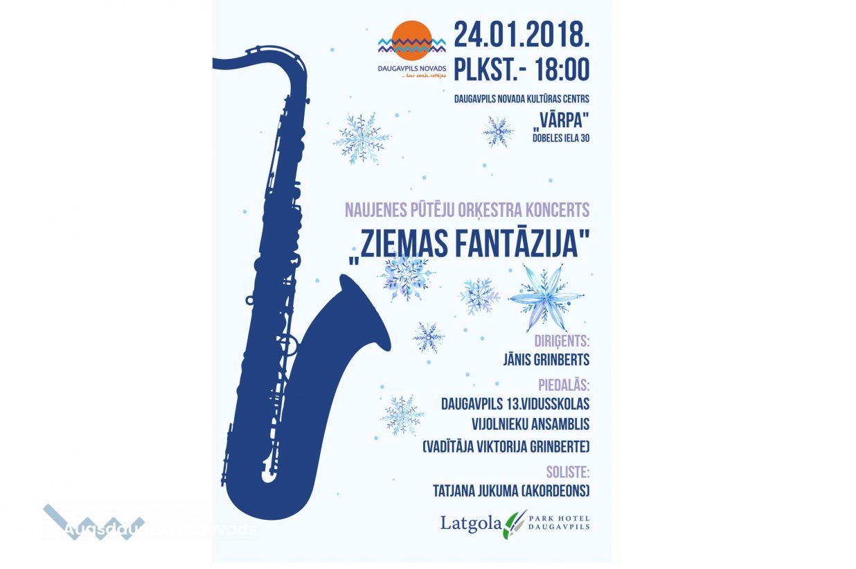 Naujenes Pūtēju orķestra koncerts “Ziemas fantāzija”18.01.2018AKTUĀLI Aicinām apmeklēt Naujenes Pūtēju orķestra koncertu "Ziemas fantāzija" š. g. 24. janvārī plkst. 18.00 Daugavpils novada kultūras centrā, Dobeles 30. Esiet laipni gaidīti!