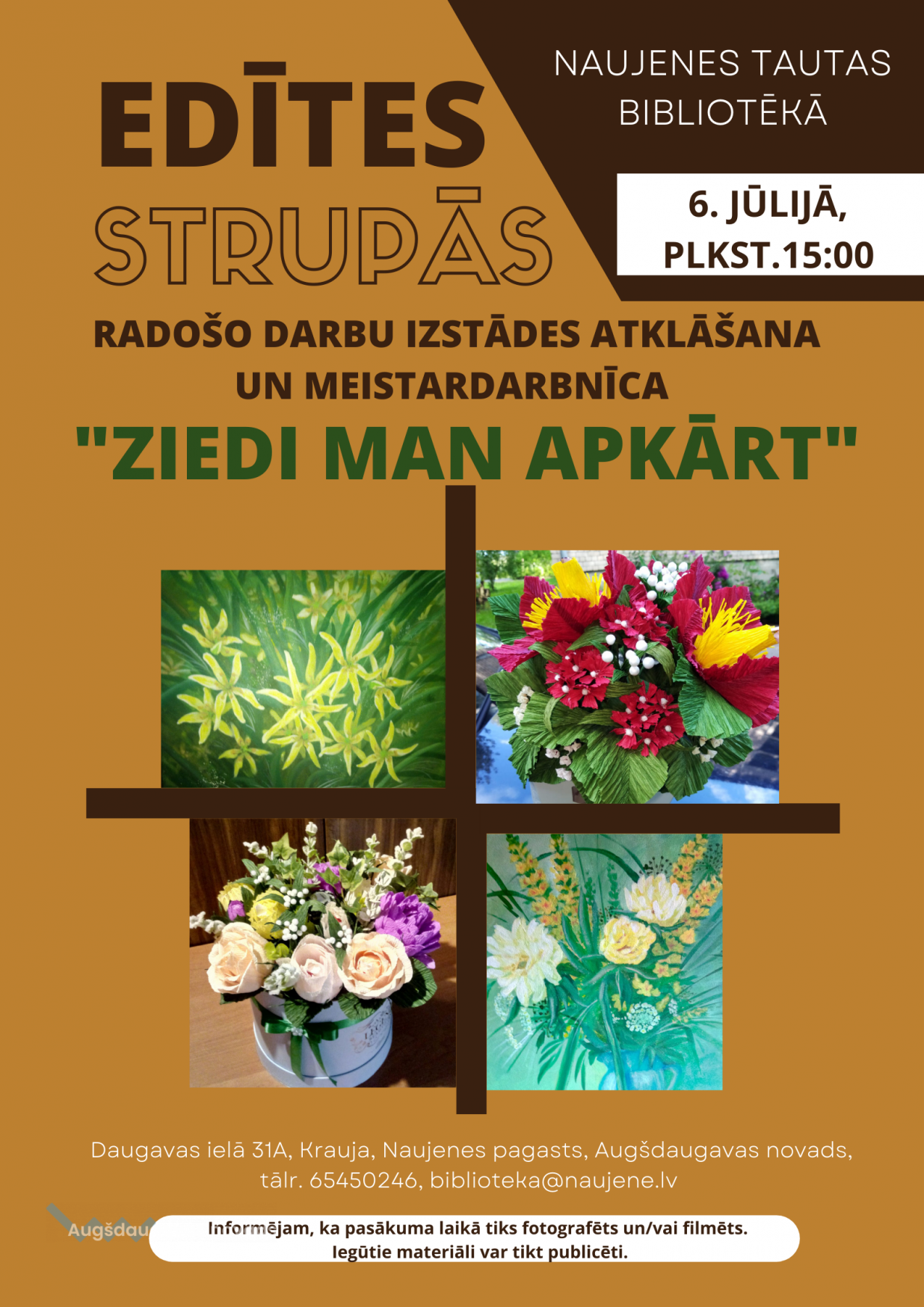 6. jūlijā plkst. 15.00 Naujenes tautas bibliotēka aicina apmeklēt Edītes Strupās radošo darbu izstādes atklāšanu un meistardarbnīcu "Ziedi man apkārt", kur jūs varēsiet ne tikai apskatīt izstādi, bet arī paši izgatavot īpašu dāvaniņu sev vai kādam citam jums tuvam cilvēkam.