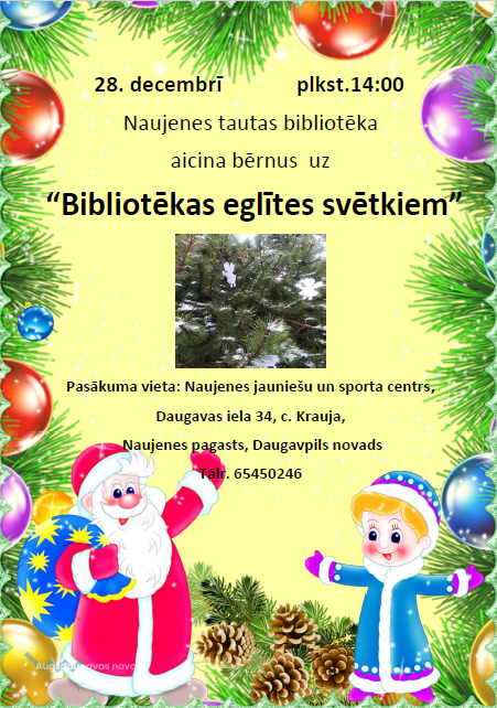 Naujenes tautas bibliotēka aicina savus mazos lasītājus uz "Bibliotēkas eglītes svētkiem", kuri notiks 28.decembrī plkst.14.00, Naujenes jauniešu un sporta centrā, pēc adreses Daugavas ielā 34, c.Krauja, Naujenes pagasts, Daugavpils novads. Tālr. uzziņām 65450246. Spēlēsim spēles, leļļu teātri, iesim rotaļās, skaitīsim dzejoļus Salavecim un saņemsim dāvanas!