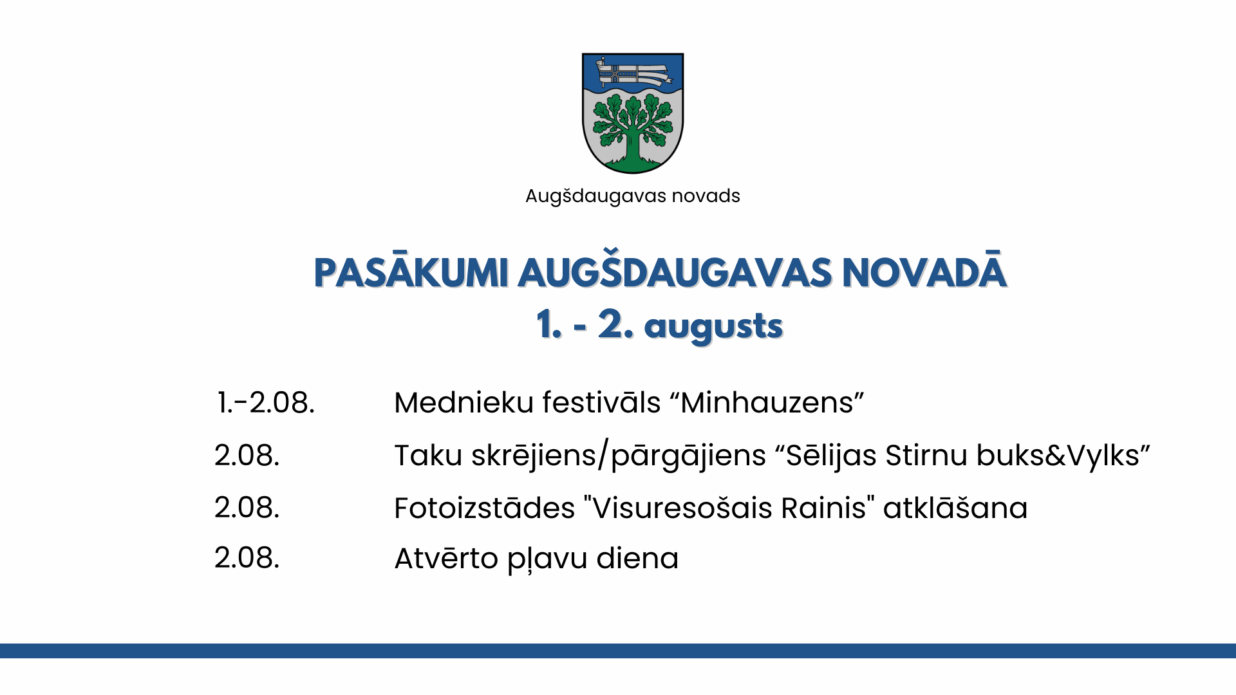 Nedēļas nogales pasākumi Augšdaugavas novadā28.07.2025AKTUĀLI https://www.minhauzensfest.lvhttps://www.stirnubuks.lv/race/2025/selija/vylkshttps://ej.uz/prgnhttps://ej.uz/ft7n
