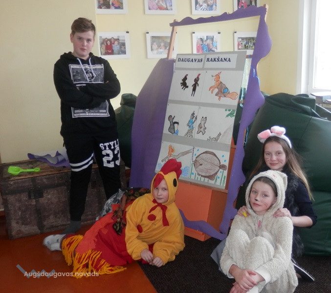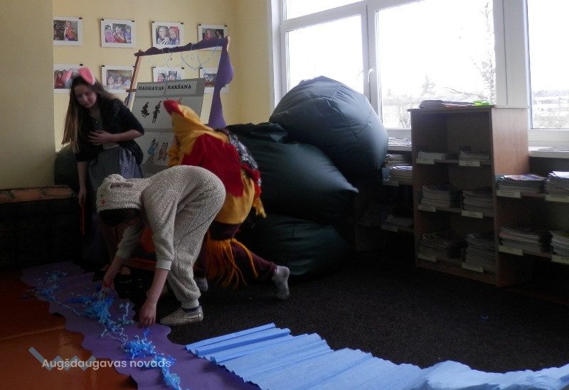 Pavasara brīvdienās lielākie bibliotēkas lasītāji radoši un aktīvi strādāja, lai sagatavotu uzvedumu “Teci, teci Daugaviņa” pēc latviešu tautas pasakas motīviem.