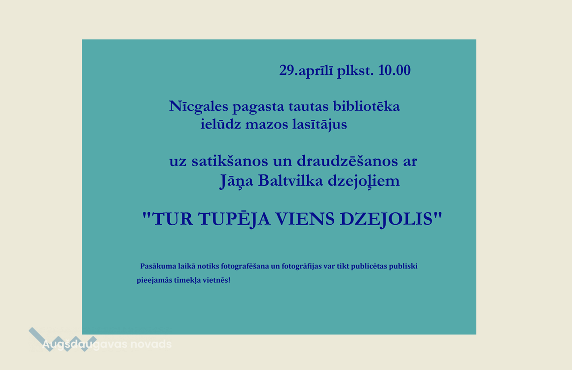 29. aprīlī Nīcgales pagasta tautas bibliotēkā notiks satikšanās un draudzēšanās ar Jāņa Baltvilka dzejoļiem "TUR TUPĒJA VIENS DZEJOLIS".