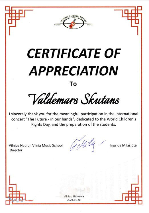 Naujenes Mūzikas un mākslas skolas pārstāvji 20.novembrī piedalījās starptautiskā pasākumā, kas notiek vienreiz gadā Jaunās Viļņas Mūzikas skolā un ir veltīts Bērnu aizsardzības dienai. Šogad koncerta nosaukums bija “Nākotne – tavās rokās”.