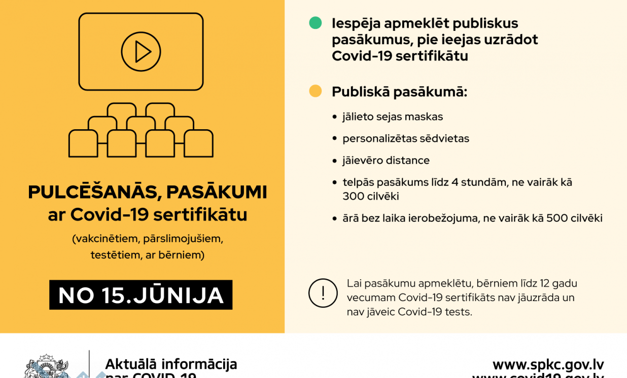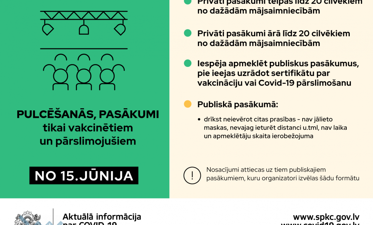 Publiskus pasākumus drīkstēs apmeklēt Covid-19 pārslimojušas vai vakcinētas personas, kā arī pasākumu rīkotāji varēs izvēlēties divus pasākumu rīkošanas formātus.