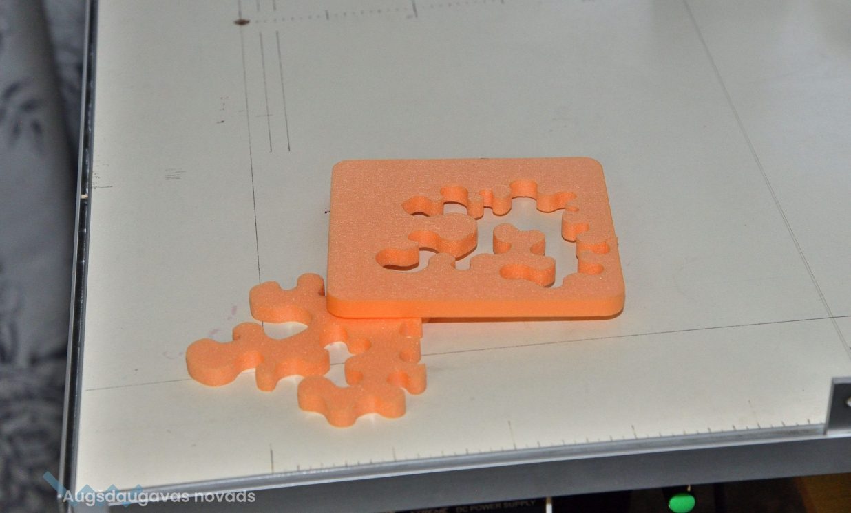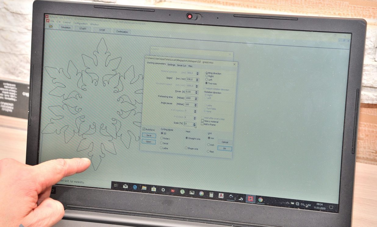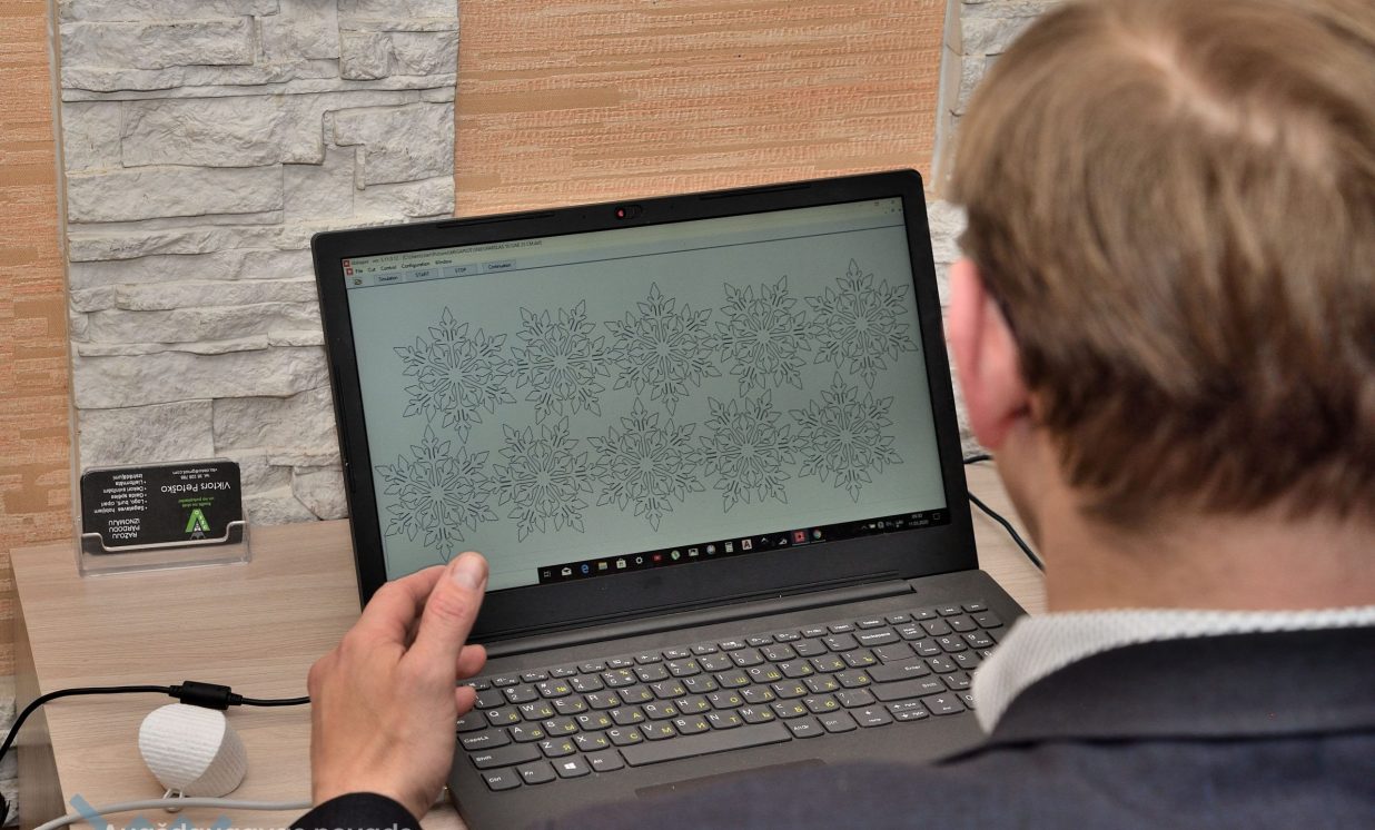 Viktors datorā ievada nepieciešamos parametrus, un mūsu acu priekšā iekārta izgriež ļoti smalku sniegpārsliņu. Iekārta pilnībā tiek vadīta ar datorprogrammas palīdzību. Putuplastu šķērē uzkarsēta stieple, caur kuru tiek laista elektriskā strāva. Katram putuplasta blīvumam ir nepieciešams uzstādīt atbilstošu temperatūru un stieples kustības ātrumu, kuru virza četri īpaši motori. No vienas biezas un ļoti blīvas ekstrudētā putuplasta loksnes var izgatavot no vienas līdz pat 1500 sniegpārsliņām. Šie darbi pirms jaungada esot viens no pieprasītākajiem izstrādājumiem. Viktora izgatavotās sniegpārsliņas rotā arī novadā atvērto jauno objektu “Sniega villa”.