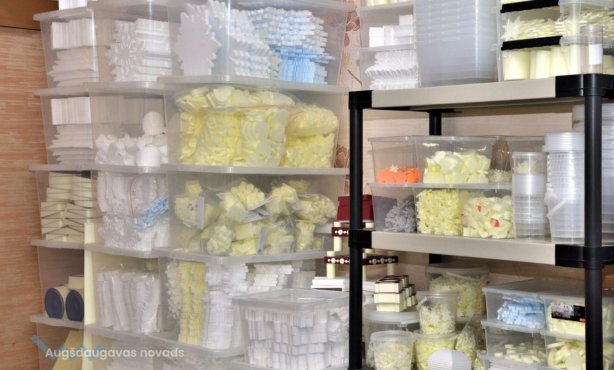 Istabā kastēs glabājas milzums dažnedažādu formu un krāsu izstrādājumu, ne tikai sniegpārsliņas. Viktors teic, ka tie ir vien pārpalikumi no pasūtījumiem. Oponēdams dzirdētajiem pārmetumiem par to, ka putuplasts nav veselīgs materiāls, Viktors uzsver, ka mūsdienās dabiska un videi nekaitīga materiāla praktiski nav, jo nav zināms, no kā tiek ražots apģērbs un dažādas saimniecības lietas.
