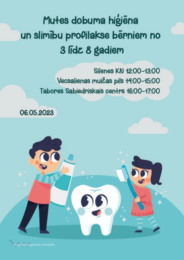 Mēs ļoti vēlamies, lai jaunā paaudze rūpētos par savu veselību. Tāpēc jaunieši no Tabores pagasta nolēma rīkot izglītojošu pasākumu pirmsskolas bērniem no Salienas, Tabores un Skrudalienas pagastiem. Jauka jauniete no Tabores pagasta Jurāte Šeškena, zobārsta asistente un Rīgas Stradiņa universitātes Zobārstniecības fakultātes 1k ursa Zobu higiēnistu studiju programmas studente, novadīs bērniem nodarbības par mutes veselības veicināšanu. Mīļi gaidīti bērni un viņu vecāki!