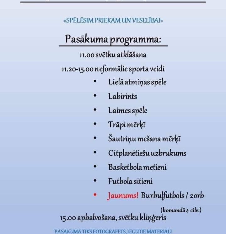 Dalībnieku vecums nav ierobežots (aicinām gan mazos, gan lielos).