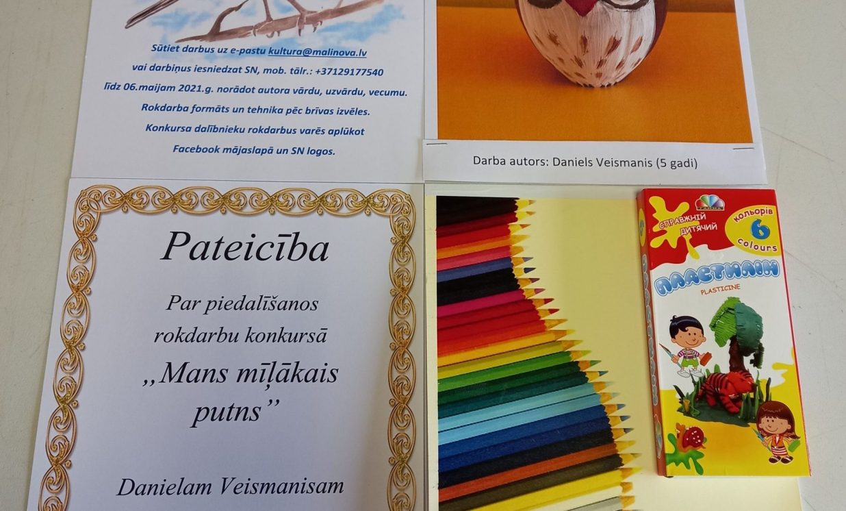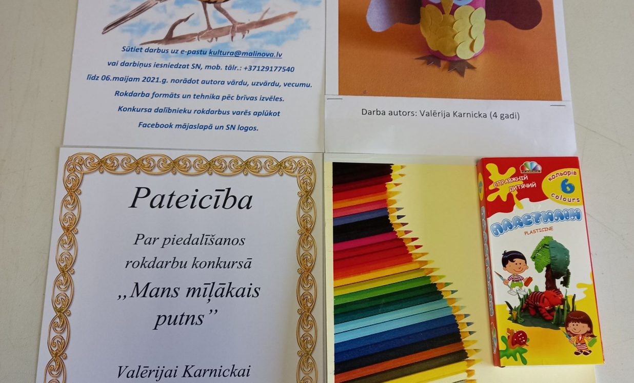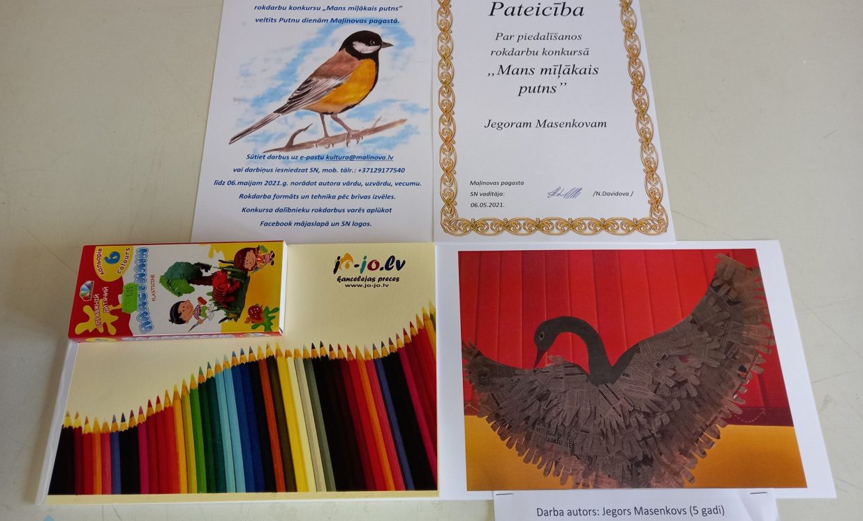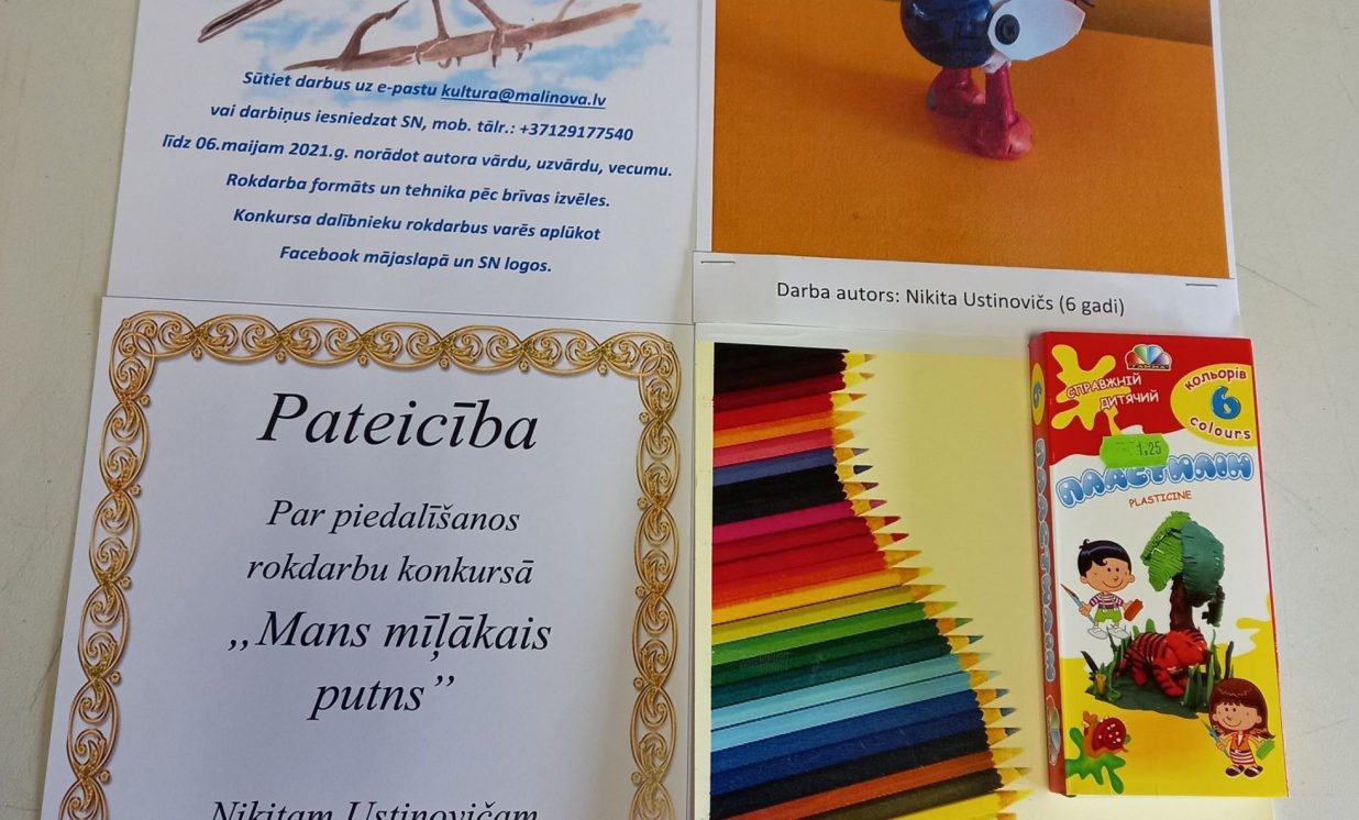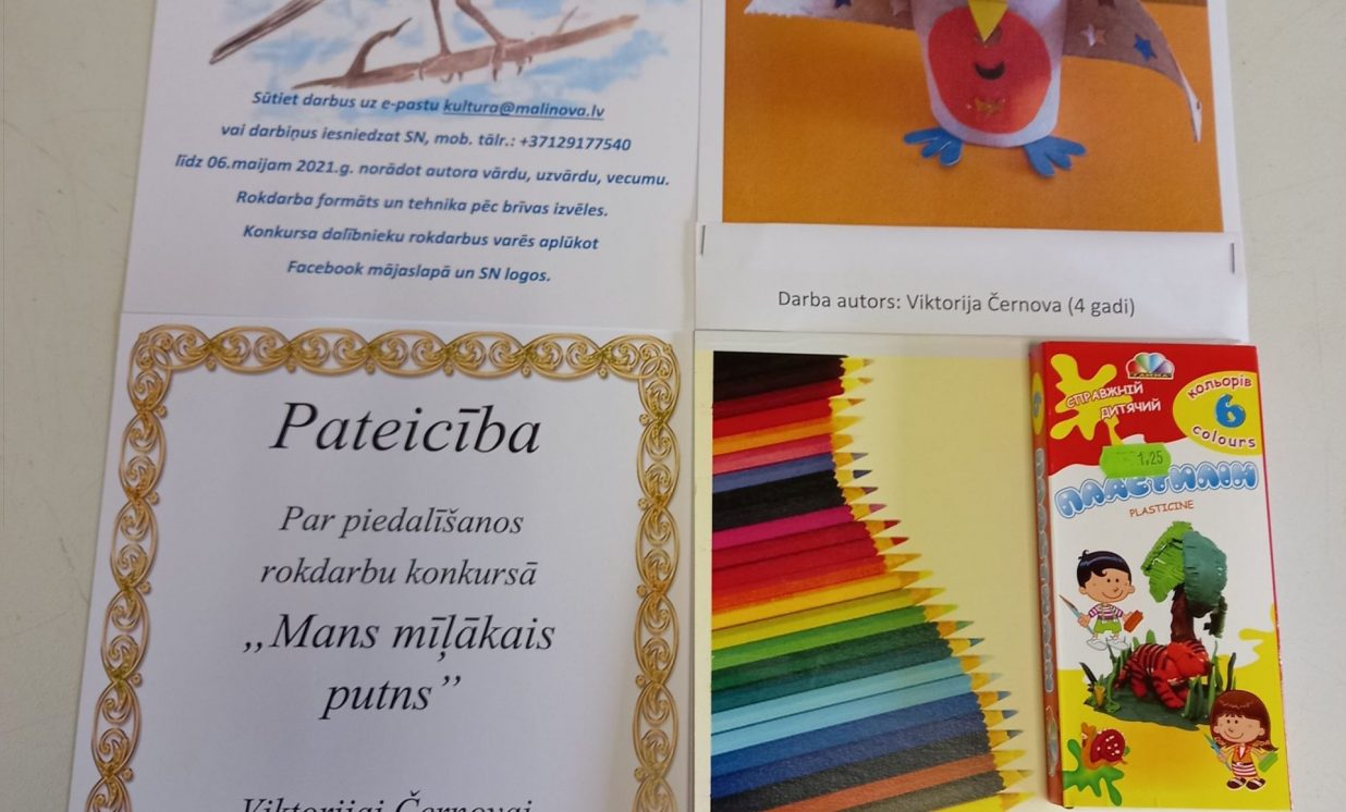 No 26. aprīļa līdz 6. maijam Maļinovas pagasta Saieta namā tika rīkots rokdarbu konkurss “Mans mīļākais putns”. Konkursā savus darbiņus iesniedza 13 bērni. Katrs izveidoja pa vienam rokdarbam, savukārt Fjodors Gurkins - divus rokdarbus. Rokdarbi tika izpildīti dažādās tehnikās - no aplikācijas un avīzes, plastilīna, diegiem, spalvām, pudelēm, čiekuriem un ozolzīlēm, koka detaļām.Visi dalībnieki saņēma pateicības un dāvanas.
