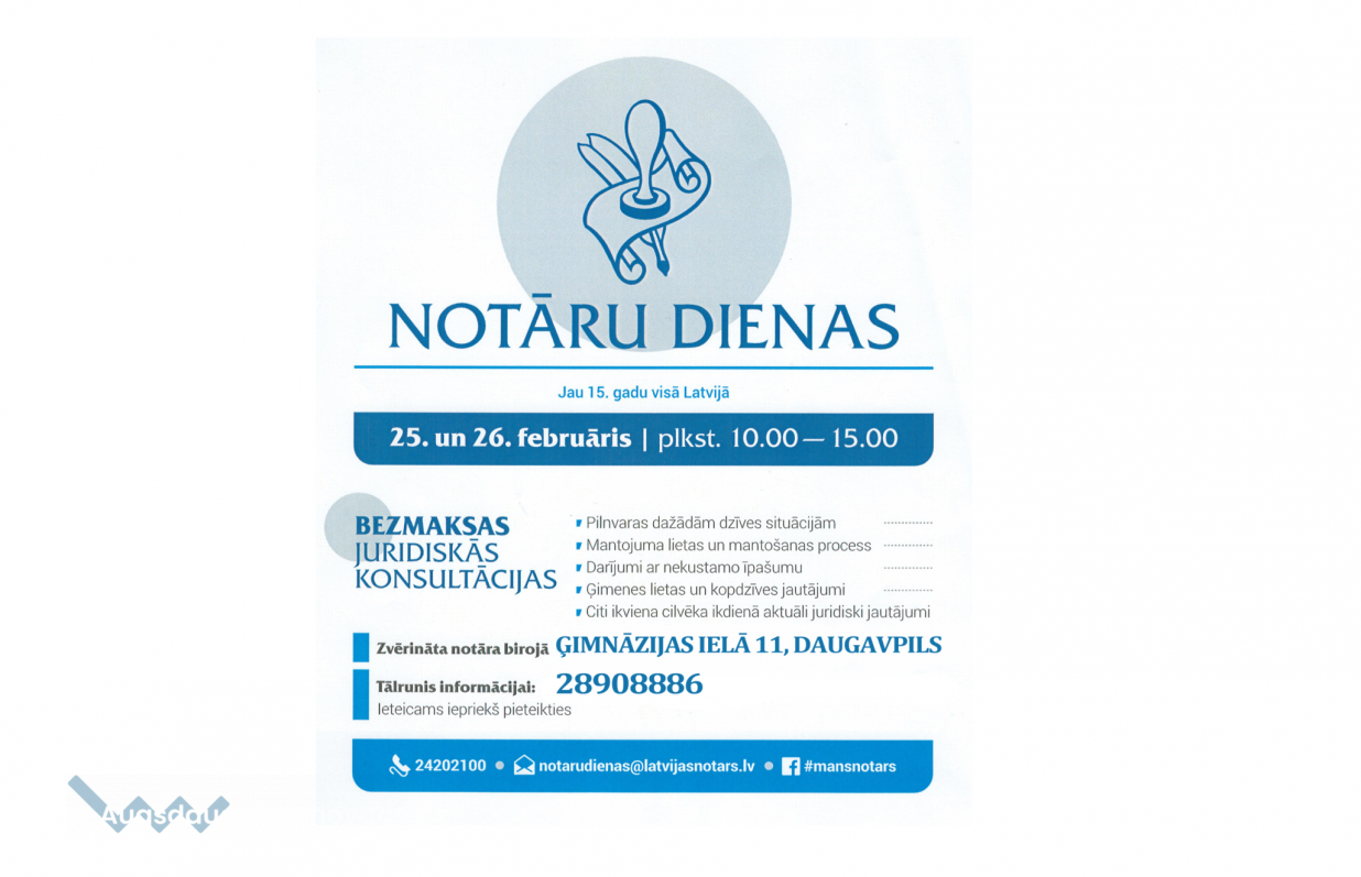 Šogad jau 15. reizi norisināsies Notāru dienas – 25. un 26. februārī zvērinātu notāru birojos visā Latvijā un tirdzniecības centrā Alfa cilvēki varēs saņemt juridiskās konsultācijas bez maksas. Jautājumus varēs uzdot arī Latvijas zvērinātu notāru klientu portālā www.latvijasnotars.lv.