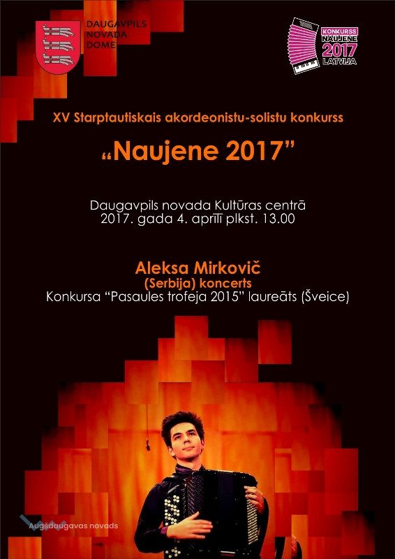 Notiks akordeonista Aleksa Mirkoviča (Serbija) koncerts27.03.2017AKTUĀLI XV Starptautiskā akordeonistu – solistu konkursa “Naujene 2017” ietvaros 4. aprīlī plkst. 13.00 Daugavpils novada Kultūras centrā “Vārpa” notiks akordeonista, konkursa “Pasaules trofeja 2015” laureāta Aleksa Mirkoviča (Serbija) koncerts.