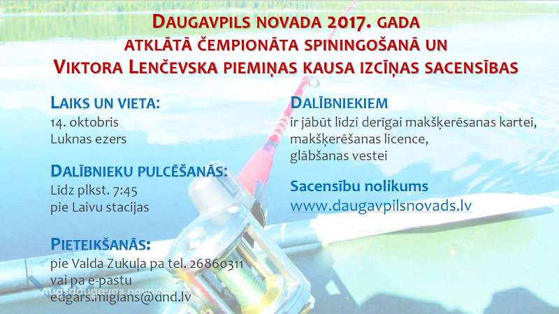 14. oktobrī no plkst. 8.00 līdz 12.00 Luknas ezerā notiks Daugavpils novada 2017. gada atklātais čempionāts spiningošanā un Viktora Lenčevska piemiņas kausa izcīņas sacensības. Komandu un dalībnieku reģistrācija un pulcēšanās līdz plkst. 7.45 pie Višķu tehnikuma Laivu stacijas. Sacensību atklāšana plkst. 7.50 pie Luknas ezera. Sacensību nolikums