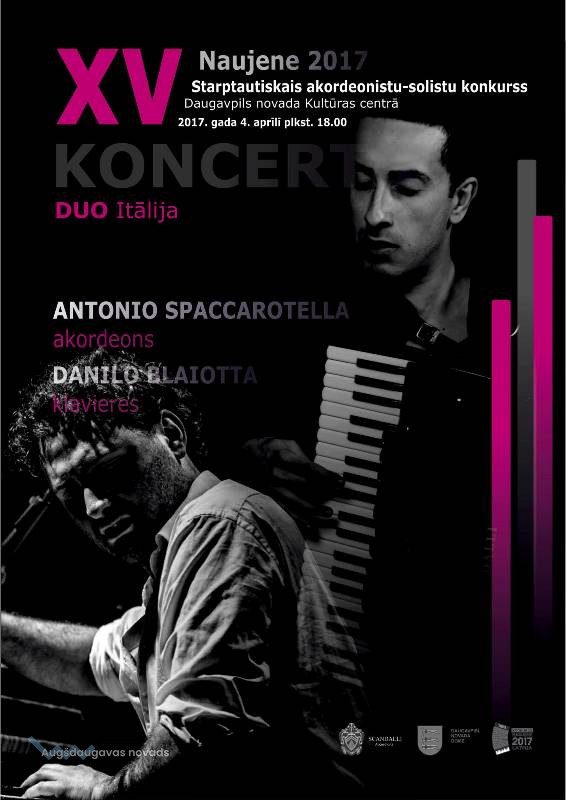 Notiks koncerts DUO Itālija27.03.2017AKTUĀLI Starptautiskā akordeonistu - solistu konkursa "Naujenes 2017" ietvaros 4. aprīlī plkst. 18.00 notiks koncerts DUO Itālija. Koncertā piedalās Antonio Spaccarotella (akordeons) un Danilo Blaiotta (klavieres).