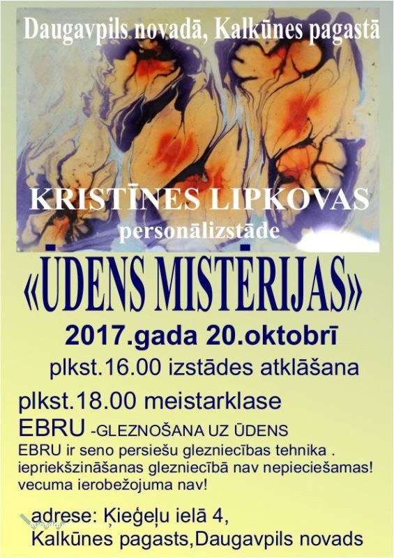 Plkst 18.00 būs meistarklase Ebru gleznošanas tehnikā (gleznošana uz ūdens). Iepriekšzināšanas glezniecībā nav nepieciešamas! Ebru ir unikāla un vienreizēja seno persiešu radīta māksla, kuras pamatā ir gleznošana uz ūdens virsmas. Zīmējums tiek zīmēts ar krāsām, kas neizšķīst ūdenī, bet paliek uz ūdens virsmas. Krāsas nesaplūst savā starpā un veido neatkārtojamus ornamentus. Uz radītā gleznojumā tiek uzklāta papīra lapa un pēc dažām sekundēm, noņemot lapu - uz tās paliek unikālais zīmējums. Gaidām Kalkūnē!