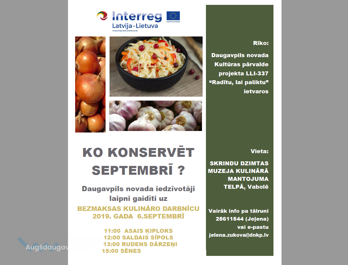 6. septembrī no plkst. 11.00 līdz 15.00 Daugavpils novada Kultūras pārvaldes projekta LLI-337 "Radīt, lai paliktu" ietvaros Vaboles Skrindu dzimtas muzeja Kulinārā mantojuma telpā notiks kulinārā darbnīca "Ko konservēt septembrī". Dalība - bez maksas.
