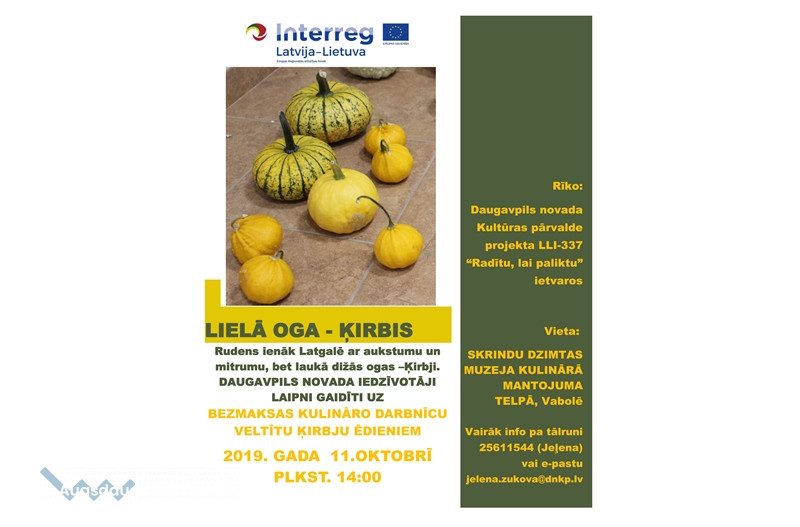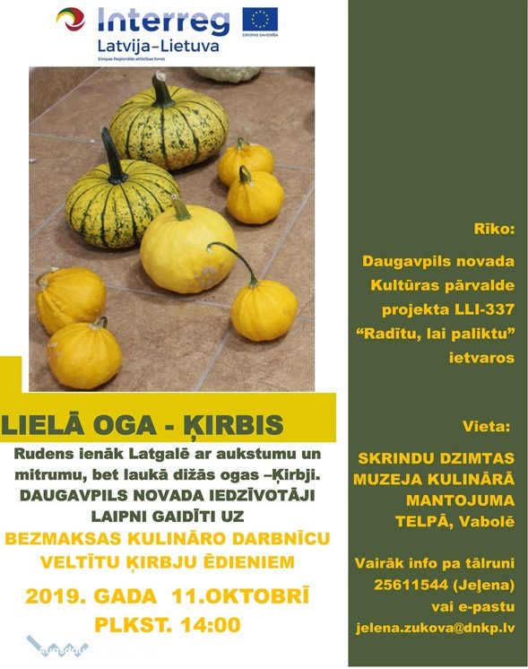Notiks meistardarbnīca “Lielā oga – ķirbis”09.10.2019AKTUĀLI 11. oktobrī plkst. 14.00 Vaboles pagasta Kulinārā mantojuma telpā norisināsies meistardarbnīca "Lielā - oga - ķirbis". Laipni aicināti visi interesenti!