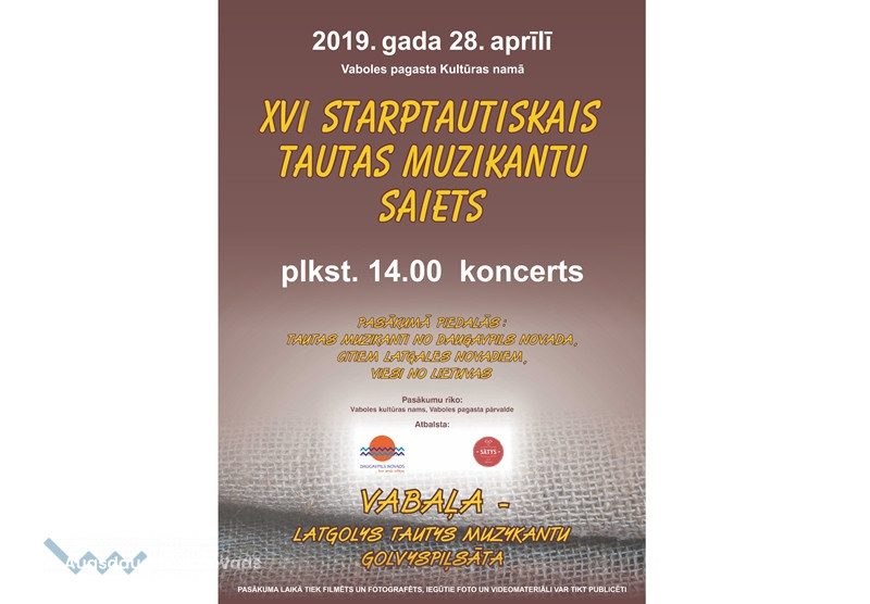 28. aprīlī plkst. 14.00 Vaboles pagasta kultūras namā norisināsies Starptautiskais tautas muzikantu saiets. Koncertā piedalīsies muzikanti no Daugavpils novada, citiem Latgales novadiem un viesi no Lietuvas.