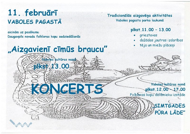 11. februārī plkst. 13.00 Vaboles kultūras namā notiks novada folkloras kopu sadziedāšanās "Aizgavienī cīmūs braucu". No plkst. 11.00 līdz 13.00 - tradicionālās aizgavēņa aktivitātes Vaboles pagasta parka laukumā.