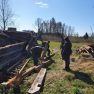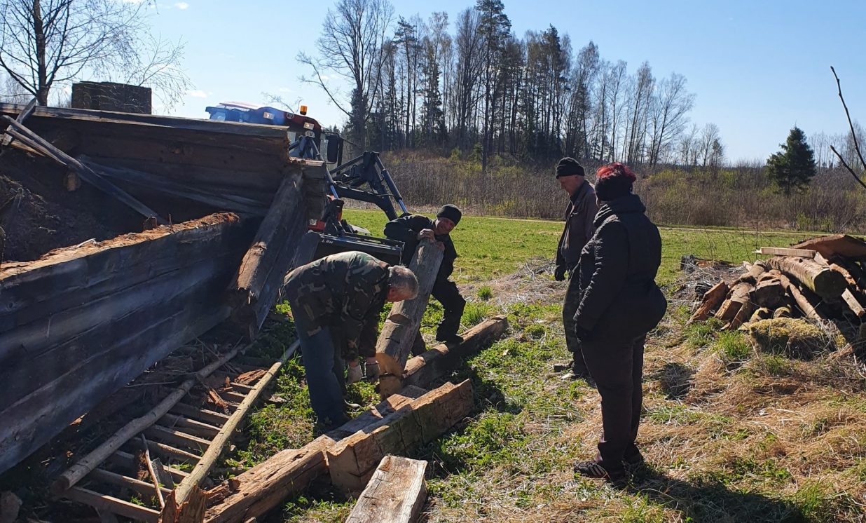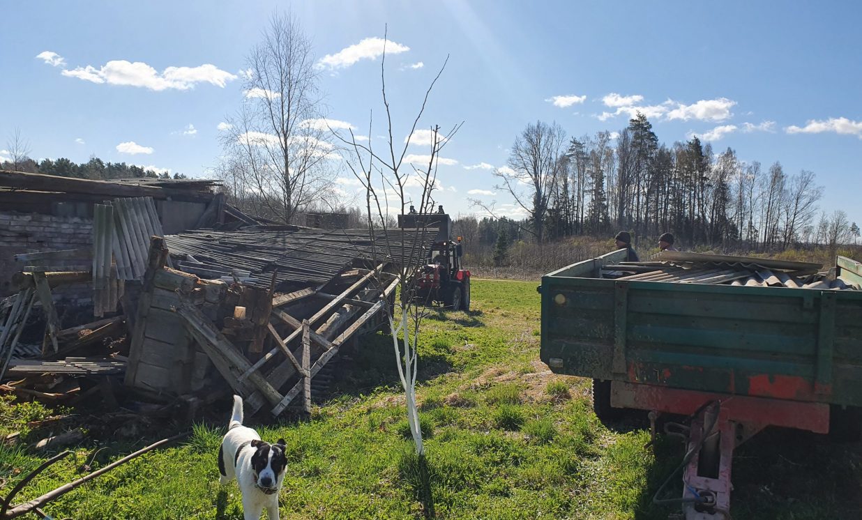 Ar šīferi tika piekrauts pilns kravas vezums. Vēl viens spiediens un vecais šķūnis ir nogāzts. Atliek tikai baļķus sakraut kaudzē.