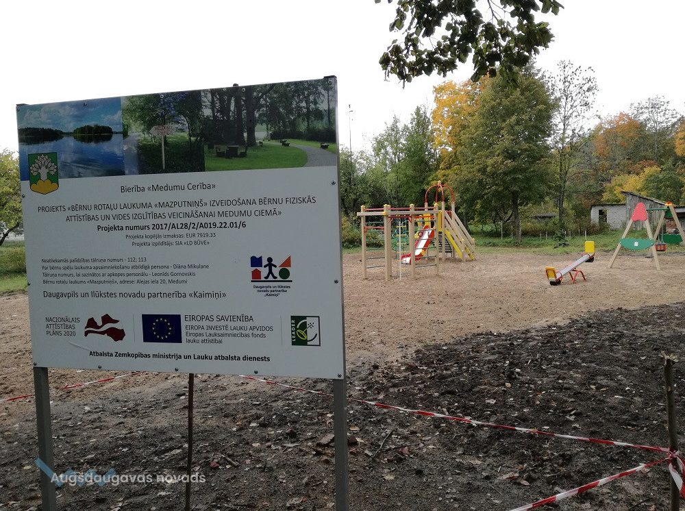 Medumu pagasta biedrības "Medumu Cerība" izstrādātais un Eiropas Lauksaimniecības fonda lauku attīstībai Latvijas Lauku attīstības programmas 2014.-2020.gadam apakšpasākuma "Darbību īstenošana saskaņā ar sabiedrības virzītās vietējās attīstības stratēģijas" ietvaros atbalstītais projekts "Bērnu rotaļu laukuma "Mazputniņš" izveidošana bērnu fiziskās attīstības un vides izglītības veicināšanai Medumu ciemā" (Nr.17-03-AL28-A019.2201-000023) ir pabeigti uzstādīšanas darbi.