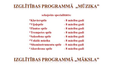 AKTUĀLI22.08.2025Ilūkstes Mūzikas un mākslas skola uzsāk izglītojamo uzņemšanu 2025./2026. mācību gadam Lasīt vairāk