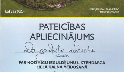 AKTUĀLI02.01.2018Novada pašvaldībai pasniegts Pateicības apliecinājums par ieguldījumu Likteņdārza Lielā kalna izveidei Lasīt vairāk