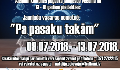 Jaunatnei27.06.2018Kalkūnē jaunieši tiek aicināti piedalīties vasaras nometnē “Pa pasaku takām” Lasīt vairāk