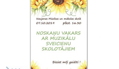 AKTUĀLI07.10.2019Naujenes Mūzikas un mākslas skola ielūdz uz koncertu veltītu skolotāju dienai Lasīt vairāk