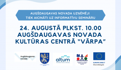 Uzņēmējdarbība16.08.2022Augšdaugavas novada uzņēmēji tiek aicināti uz informatīvu semināru Lasīt vairāk