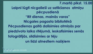 Kultūra05.03.2018Nīcgales bibliotēkā notiks atmiņu pēcpusdiena “Rit dienas, mainās varas” Lasīt vairāk