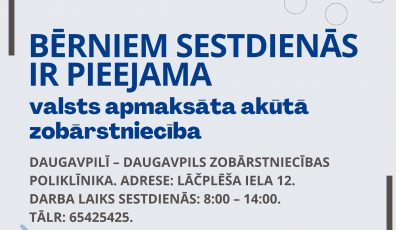 Sociālais darbs un veselība13.07.2022Bērniem sestdienās ir pieejama valsts apmaksāta akūtā zobārstniecība Lasīt vairāk
