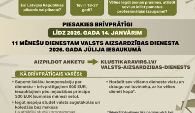 Jaunatnei03.11.2025Jaunieši aicināti pieteikties 2026. gada jūlija valsts aizsardzības dienesta iesaukumam Lasīt vairāk
