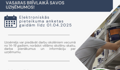 Uzņēmējdarbība26.02.2025Aicinām novada uzņēmējus pieteikties skolēnu vasaras nodarbinātības programmai Lasīt vairāk