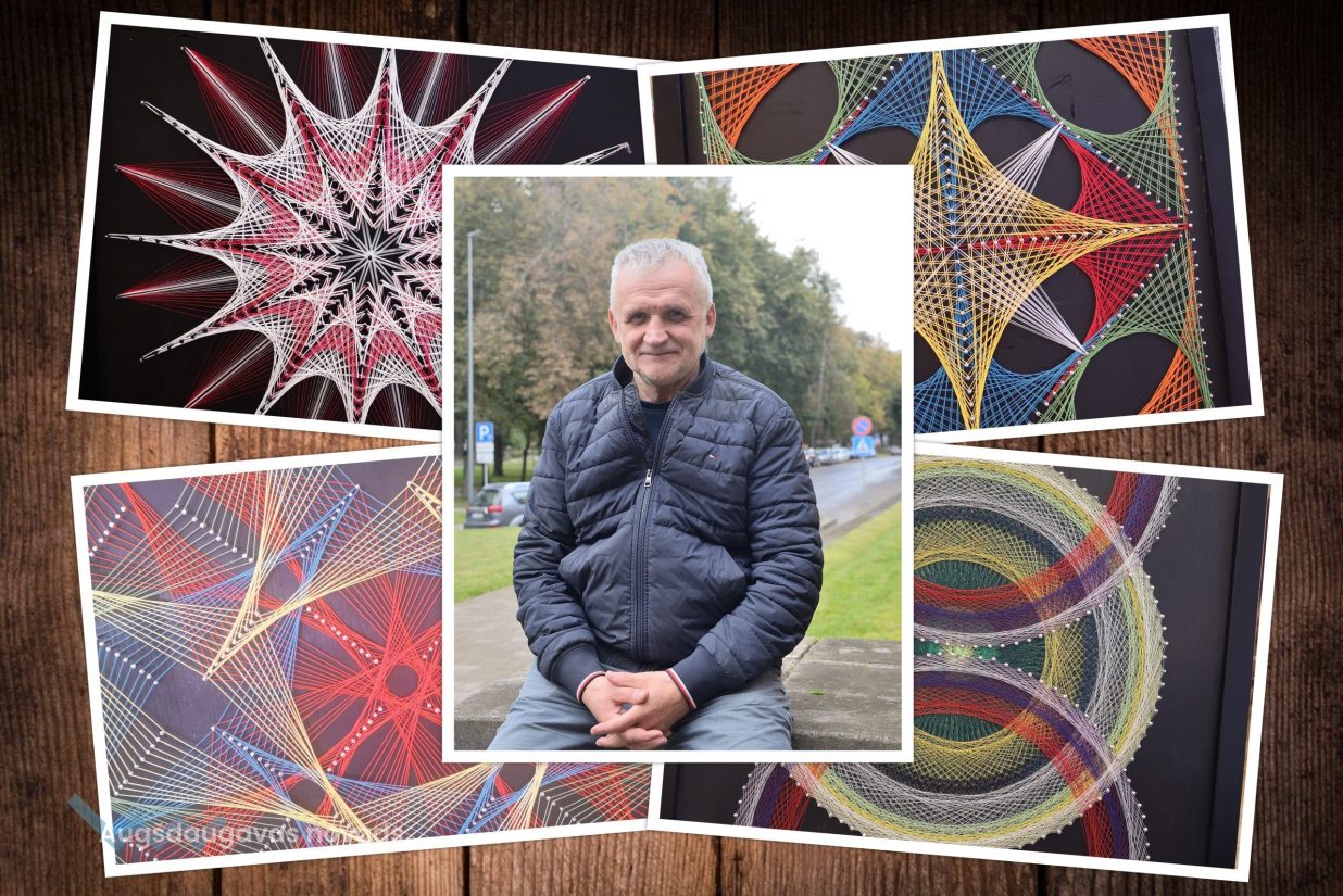 Ilūkstes Kultūras un mākslas centrā var aplūkot Vitālija Kaušeļa darbu izstādi – neparastas gleznas, veidotas no naglām un krāsainiem diegiem uz koka pamatnes. Šo rokdarbu tehniku, sauktu par stīgu mākslu, Vitālijs apguvis pavisam nesen, sākoties pandēmijai, un jautri to sauc par Covid paveidu. “Kādu brīdi strādāt nevarēja, vajadzēja ar kaut ko nodarboties,” tā savu pievēršanos mākslai skaidro Vitālijs. Pati tehnika neesot viņa izdomāta, bet gan uzieta Pinterest tīmekļa vietnē. Patiesībā stīgu māksla izgudrota Anglijā gandrīz pirms četriem gadsimtiem, izmantojot parastās naglas, diegus un veidojot uz dēļiem dekoratīvus rakstus. Ar laiku senā aušanas tehnika tika pilnveidota un kļuvusi populāra pasaulē.